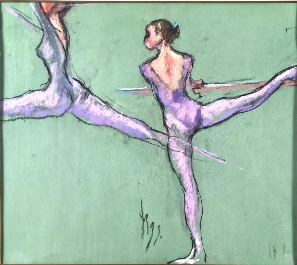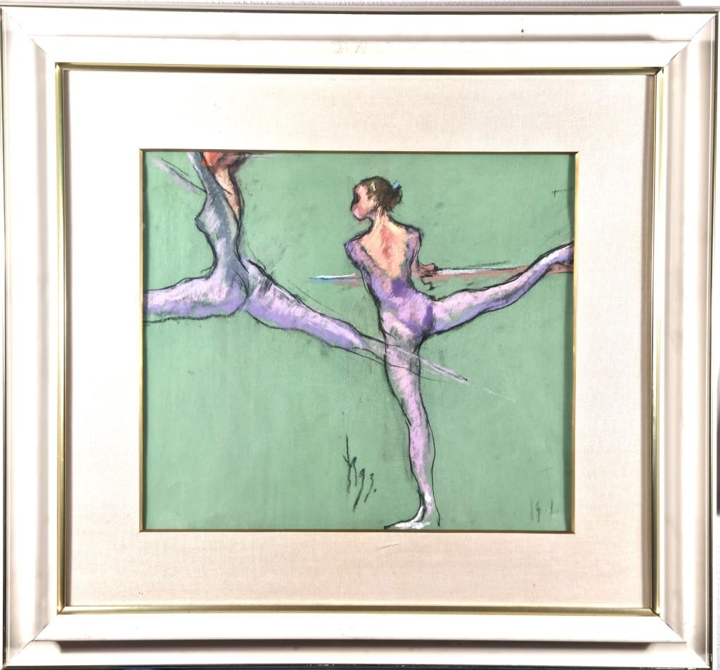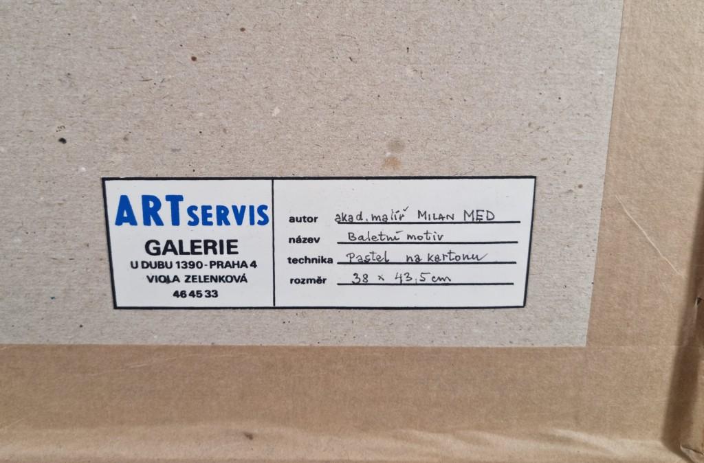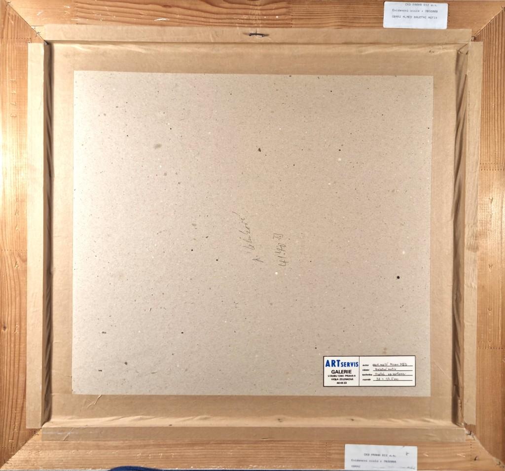 V díle autora Milana Meda se setkáváme s figurativními motivy z prostředí baletu či gymnastiky. Autor zachycuje pohyb těl několika přes sebe ležícími konturami, které nepůsobí strnule. Kontury jsou doplněné plochami barev, ty jsou s lehkostí, svižně prokreslené. Kresba je lehce stylizovaná a zjednodušená, pro umělce je také typická práce na kolorovaný podklad. Kombinovaná technika na papíře pod sklem, rozměry s rámem 72 x 67 cm, bez rámu 43 x 38 cm. Signováno dole uprostřed, viz foto.
