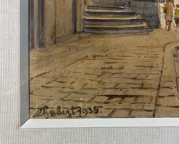 Povedené dílo vyobrazující pohled na kostel sv. Jakuba a kostel Nanebevzatí Panny Marie, z perspektivy chodce. Akvarel na papíře. Zarámováno, paspartováno, pod sklem. Rozměry malby jsou 17 x 28 cm. Celkové rozměry i s rámem jsou 38 x 53 cm. Signováno na levé straně dole Hubert, viz foto, s datací 1935. Rám je na dvou místech lehce odraný, jinak v perfektním stavu.