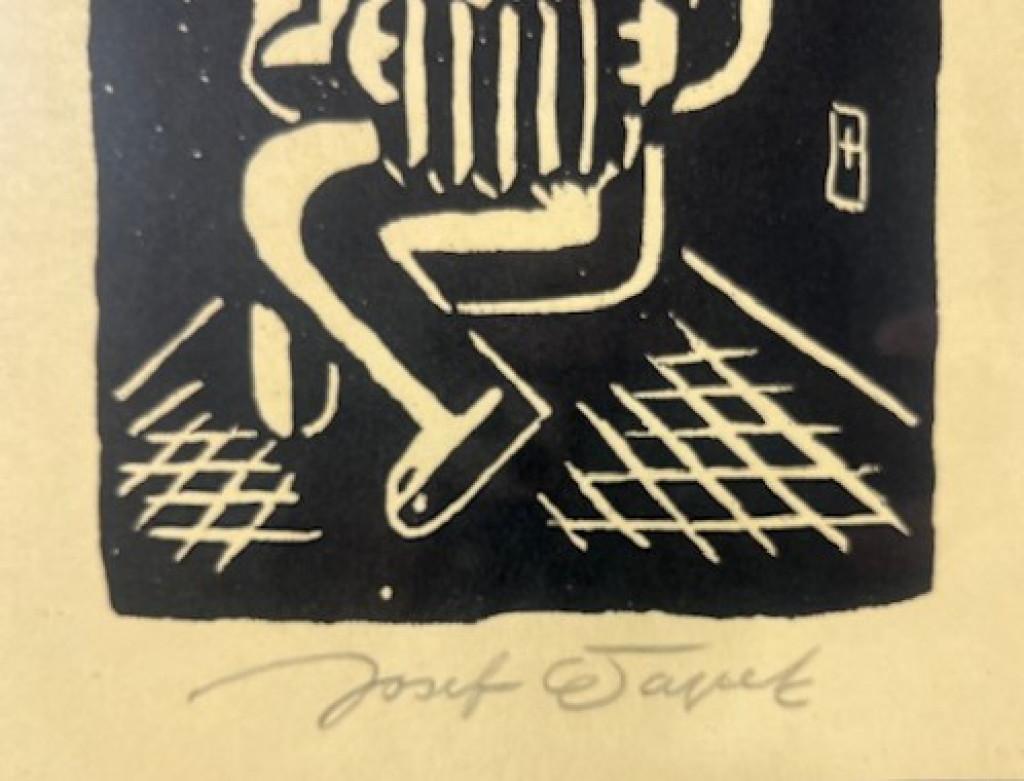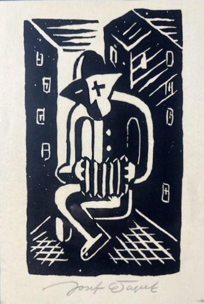 Drobná grafika od Josefa Čapka, který tvořil díla v duchu kubismu. Námět je abstrahovaný na geometrické tvary, technika dřevořezu dovoluje umělci vytvářet syté plochy pokryté barvou, které doplňují plochy čistého papíru. Dílo je zajímavé po kompoziční stránce, starý harmonikář jako by byl vklíněný mezi domy, které ho obklopují. Dřevořez na papíře pod sklem, rozměry s rámem 37 x 27 cm, rozměry grafiky 22 x 15 cm. Signováno uprostřed dole "Josef Čapek".