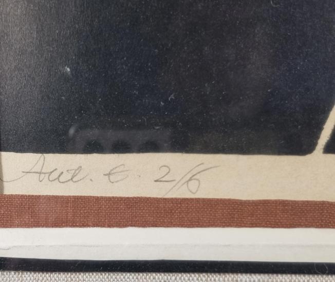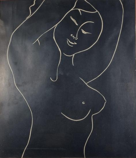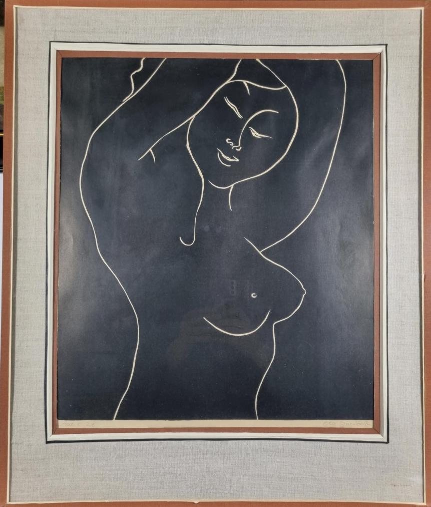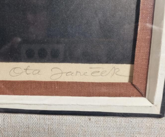Krásná, prostá grafika od Oty Janečka. V díle obrací obvyklý princip tmavé linky na světlém pozadí a vytváří negativní kresbu, na černé ploše se tak světlou linkou rýsují křivky ženy s jejím veškerým půvabem. Janeček má lehce rozpoznatelný rukopis a příjemnou stylizaci. Grafika na papíře, rámováno pod sklem, rozměry s rámem 72 x 60 cm, rozměry díla 51 x 44 cm. Signováno vpravo dole "Ota Janeček", výtisk 2/6.