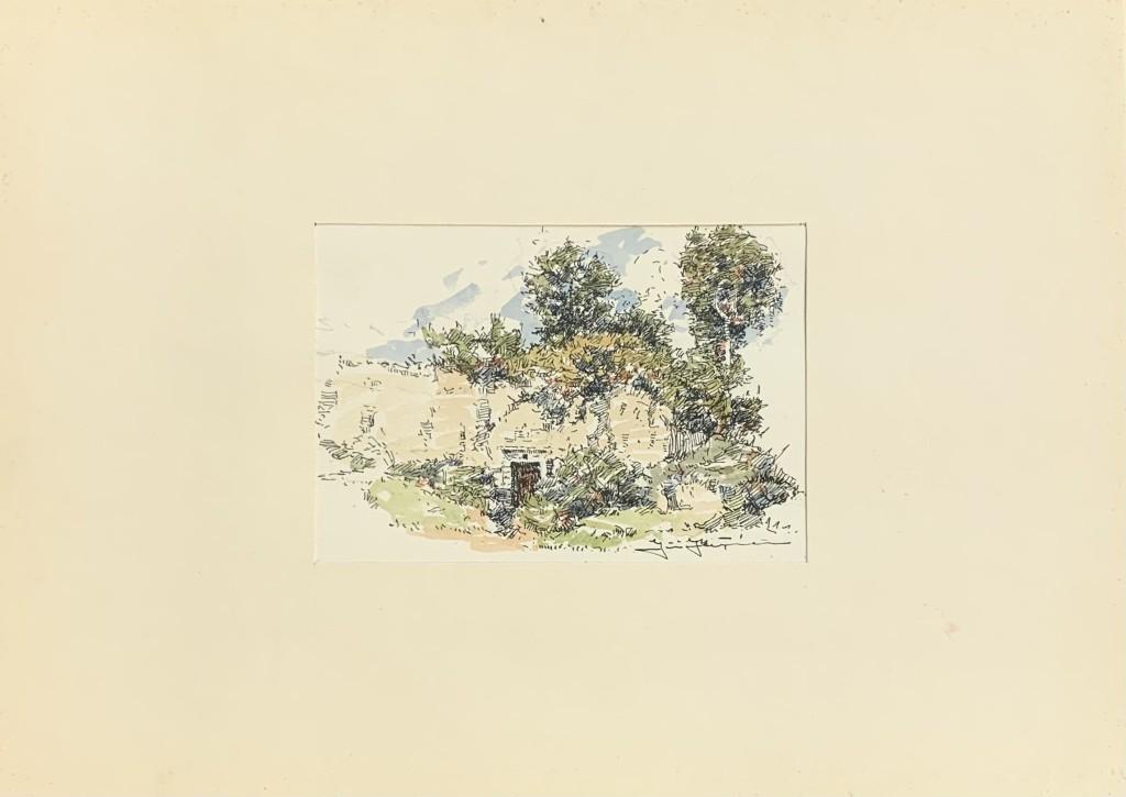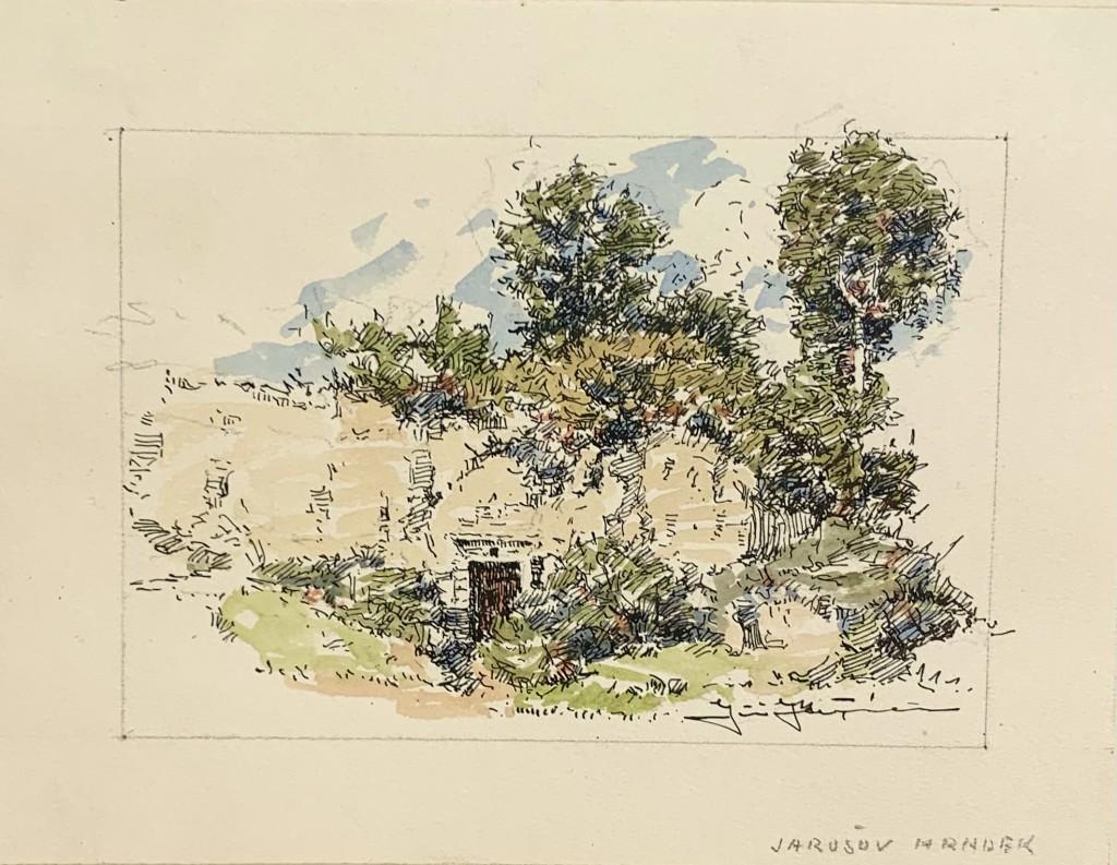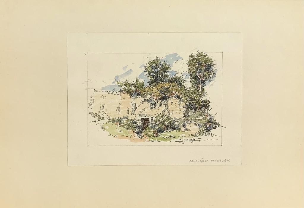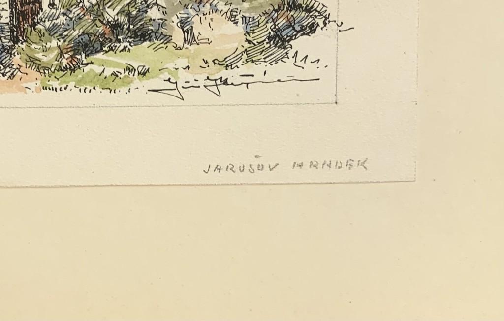 Kolorovaná kresba v paspartě o celkovém rozměru 31 x 22 cm, rozměr samotné kresby 17 x 13 cm. Signováno v pravém dolním rohu "Jiří Heřman"