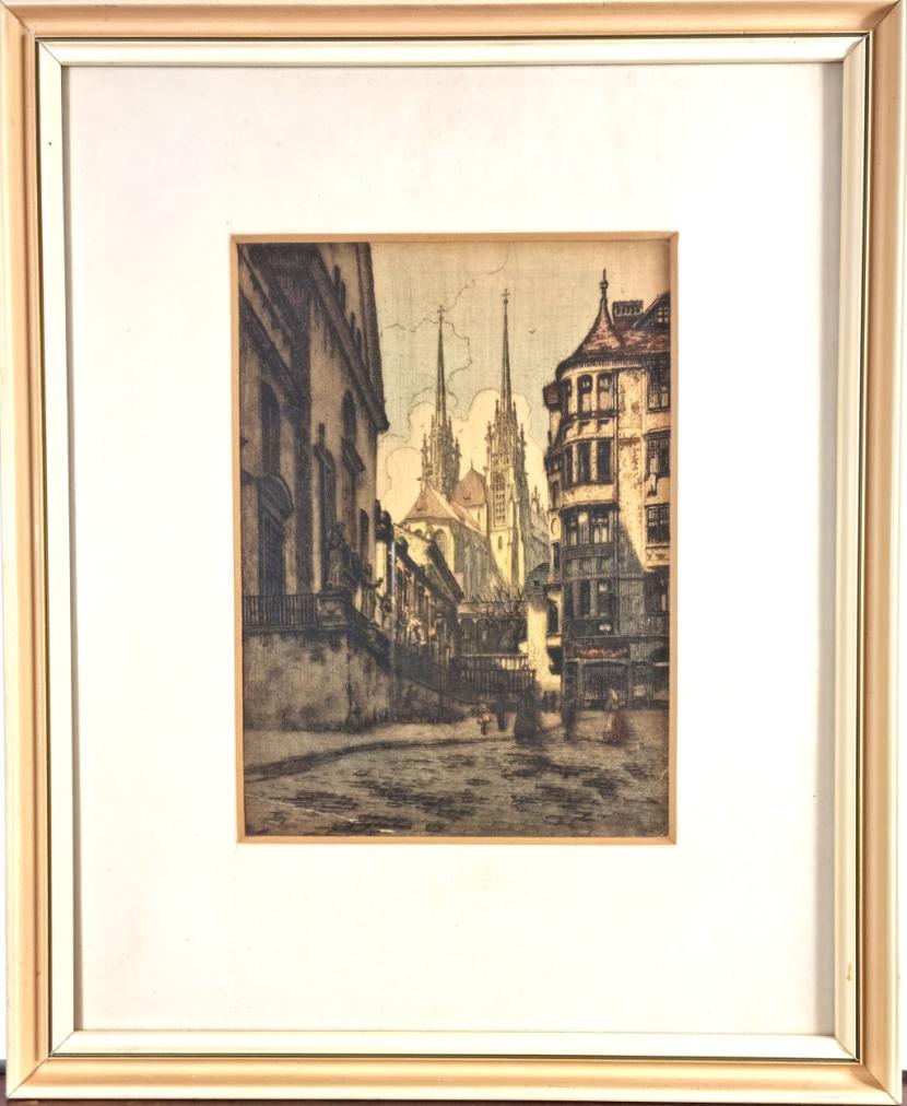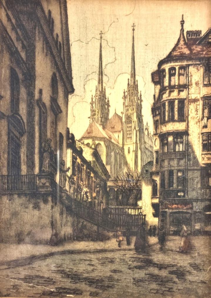 Pečlivě zpracovaná grafika s námětem pohledu na brněnské Kapucínské náměstí. Grafika působí velmi realisticky, jemné svislé čáry jsou dokonale kladeny vedle sebe a podílí se na budování architektury v obraze, i stínů, které přes ní přecházejí. Kostel je zde ponořen do mraku a osvětlen, čímž stavbě umělec přidává na sakrálním dojmu oproti potemnělé uličce, ze které se na kostel díváme. Grafika - suchá jehla je příjemně kolorována. Grafika na papíře pod sklem, rozměry s rámem 36 x 29,5 cm, bez rámu 20 x 14 cm. Signováno viz foto. Singer.