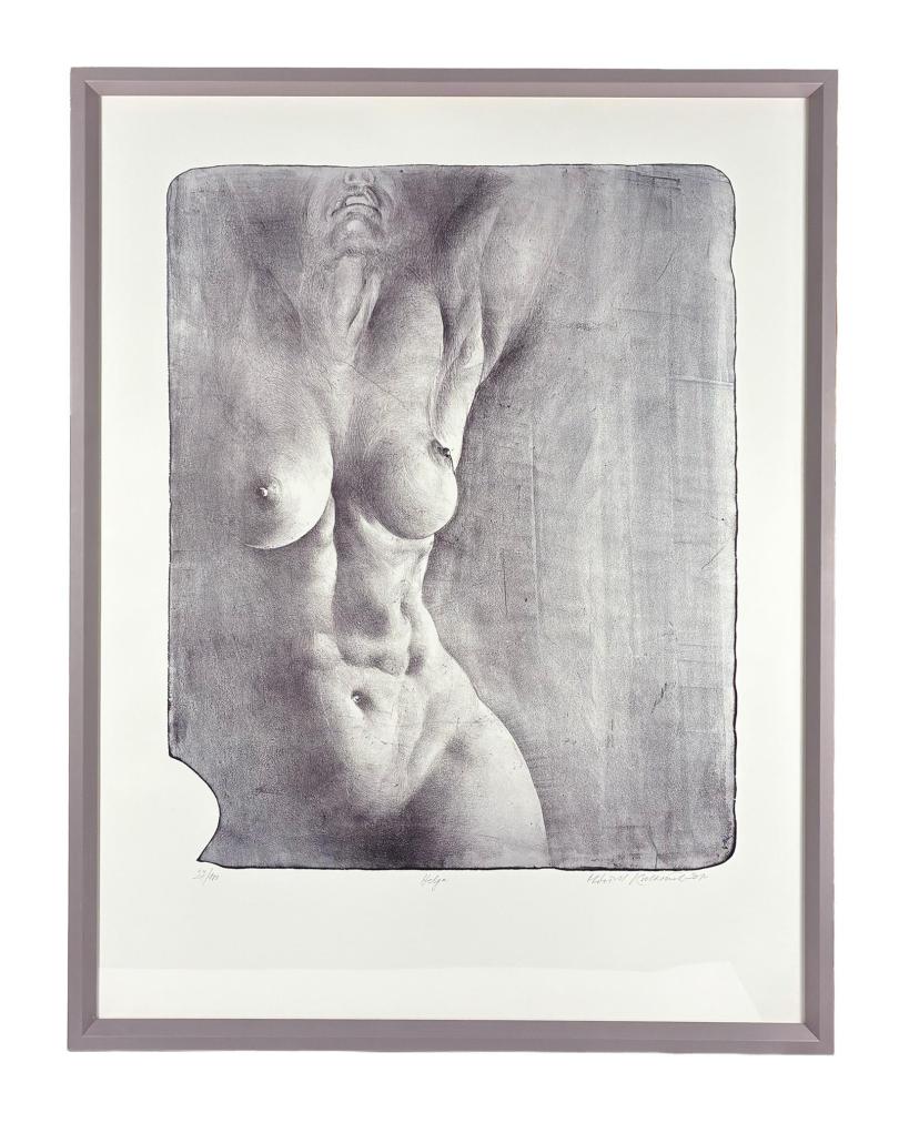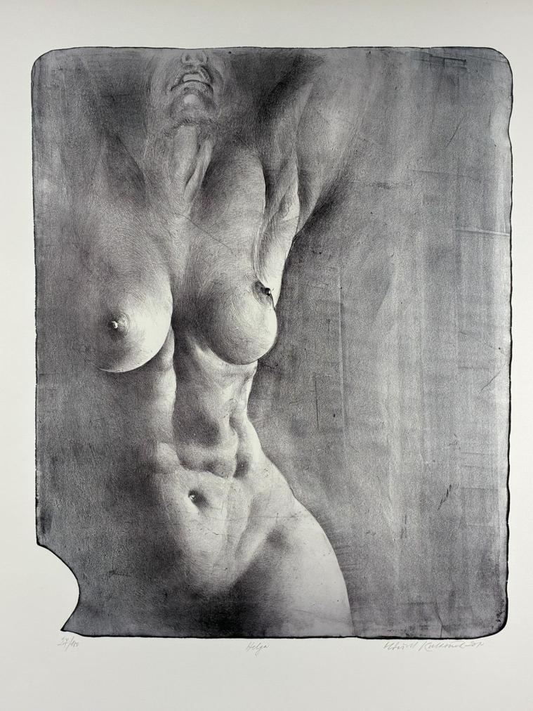Grafika od jednoho s předních českých grafiků Oldřícha Kulhánka. V díle vytváří pro něj typický námět ženského aktu, Kulhánek dokáže skvěle zachytit hmotu lidského těla. V pozadí vytváří sktrukturu, která působí jako tahy barvy. Litografie na papíře, rámováno pod sklem, rozměry s rámem 74,5 x 58 cm, rozměry díla 55 x 43 cm. Signováno vpravo dole " Oldřich Kulhánek 2010" výtisk 27/150.