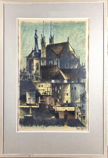 Grafika od Bohumíra Matala s námětem dominanty Brna. Kostel je tvořen několika vrstvami šrafur a prokreslených ploch, vrstvy se podílejí na vytváření hloubky v díle a vyvažují je plochy osvícené. Autor v díle střídá světlo a stín a vytváří tak kontrastní výjev s příjemnou atmosférou. Barevná litografie na papíře, paspartováno pod sklem, rozměry s rámem 66 x 46 cm, rozměry díla 45 x 27 cm. Signováno vpravo dole "Matal 45".