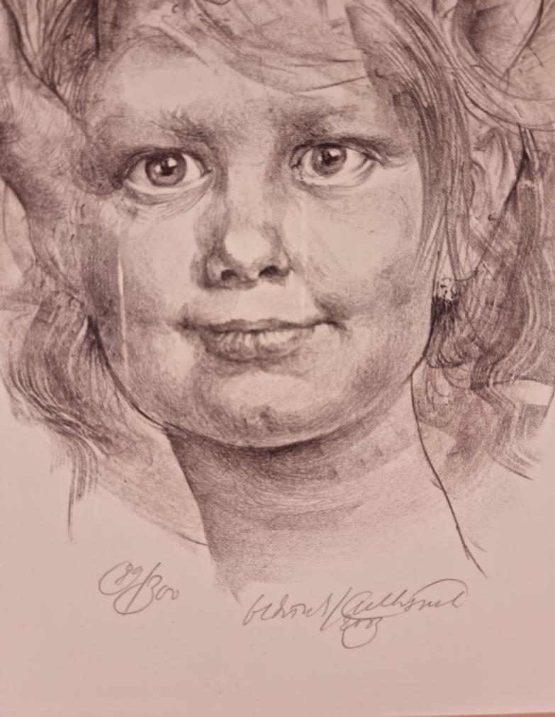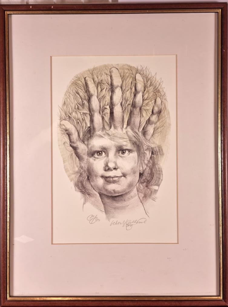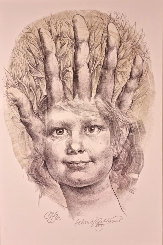 Na této kresbě splývá obličej dívky s rukou. Kulhánek je významný svými přesně kladenými linkami, jeho kresba je velmi plastická a realistická, často je ústředním námětem lidské tělo, či nějaká jeho část. V tomto námětu kombinuje dlaň a tvář, která vystupuje z rostlinného pozadí, to vytváří dívčiny vlasy. Umělec kombinuje realistický výjev s surreálním. Kresba na papíře pod sklem, rozměry s rámem 41 x 31 cm, rozměry bez rámu 26 x 17,5 cm. Signováno viz foto - "Oldřich Kulhánek 2003"