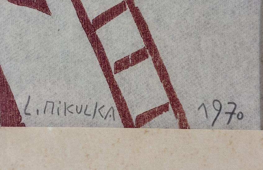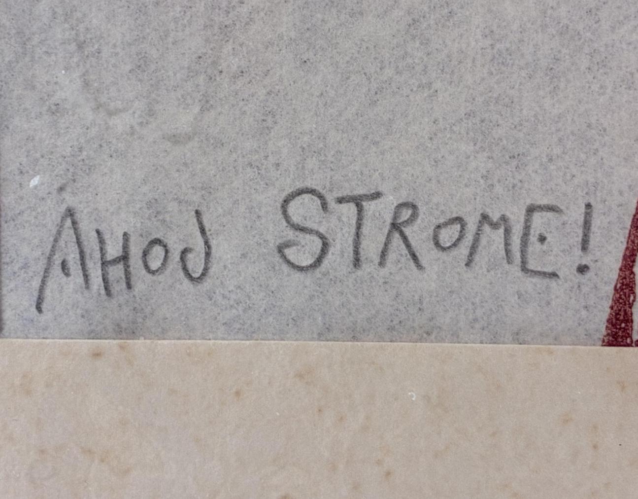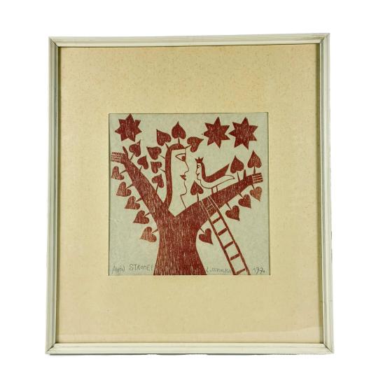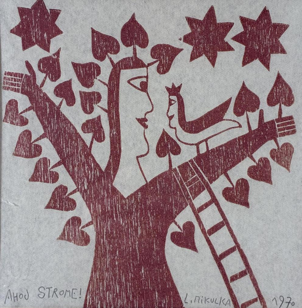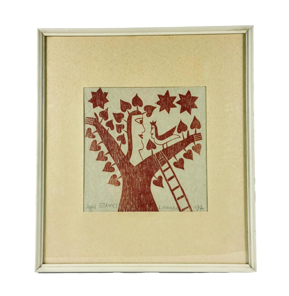 Milá grafika českého umělce Aloise Mikulky s názvem ´´Ahoj strome!´´. Dřevoryt, červený tisk na papíře. Zarámováno, pod sklem, paspartováno. Rozměry díla jsou 17,5 x 18 cm. Celkové rozměry s rámem jsou 31 x 34,5 cm. Signatura se nachází na pravé straně dole L. Mikulka, 1970.