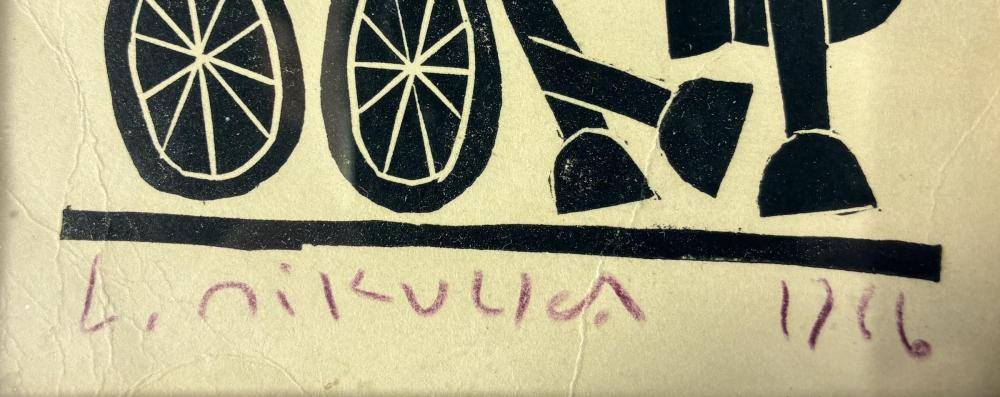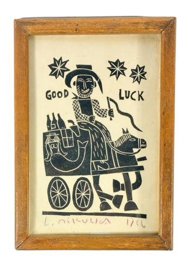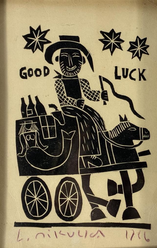 Veselá drobná grafika od českého umělce Aloise Mikulky zachycující usměvavého muže na povoze taženém koněm, se třemi zářícími hvězdami nad hlavou a nápisem: Good Luck. Dřevoryt na papíře. Zarámováno, pod sklem. Zadní strana rámu chybí. Rozměry díla jsou 10 x 15 cm. Rozměry s rámem jsou 17 x 12 cm. Signatura se nachází pod grafikou: L. Mikulka 1966.