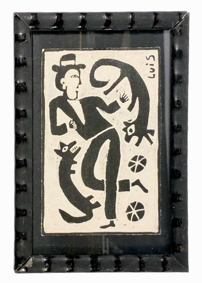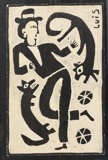 Drobná hravá grafika od Aloise Mikulky vyobrazující muže v buřince a dva podlouhlé psíky. Dřevoryt na papíře, zarámováno do dřevěného rámečku, pod sklem. Rozměry díla jsou 15,5 x 10 cm. Celkové rozměry jsou 15 x 21 cm. Nesignováno.