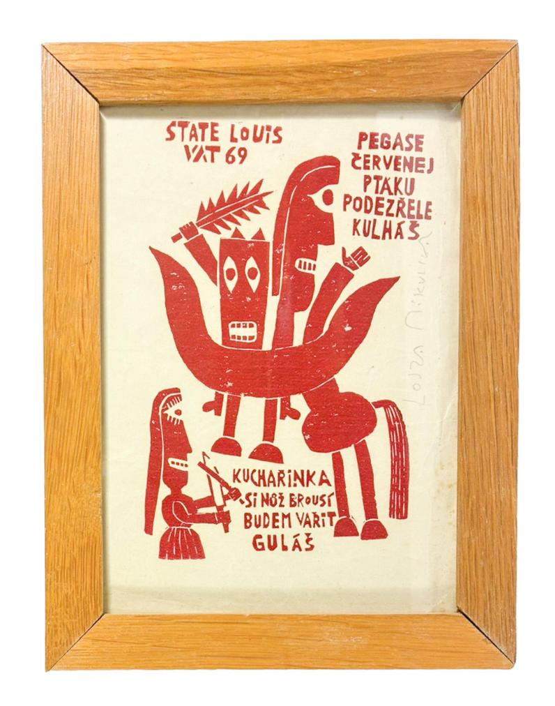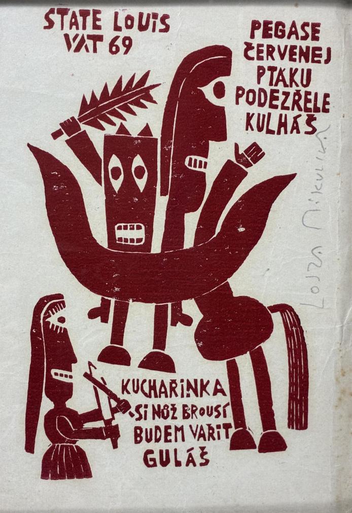 Grafické dílo českého umělce Aloise Mikulky s vtipným textem. Technika dřevoryt, červený tisk na papíře. Zarámováno pod sklem. Rozměry listu jsou 12,5 x 18 cm. Celkové rozměry s dřevěným rámem jsou 17 x 22, 5 cm. Zadní část rámu chybí. Papír je na pravé straně pokrčený s několika skvrnami. Signováno na pravé straně: Lojza Mikulka. V horní části nápis State Louis 69.