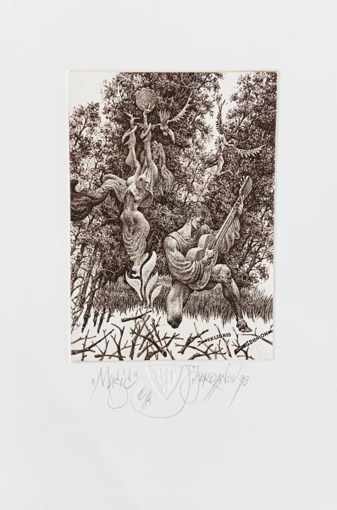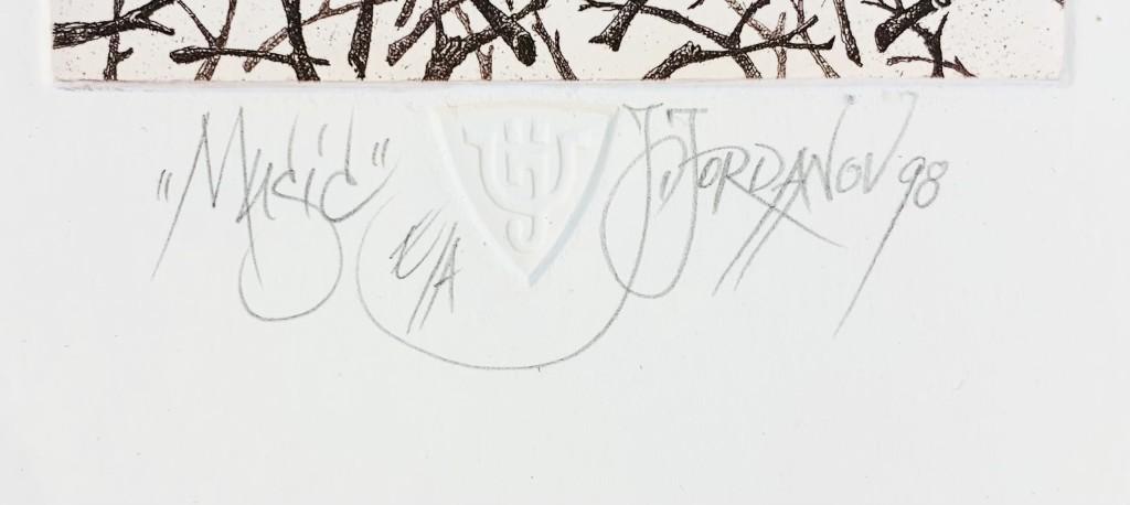 Lept o rozměrech 18 x 12,5 cm, rozměr samotného díla 10 x 7 cm. Signováno v levém dolním rohu "J. Jordanov 98"