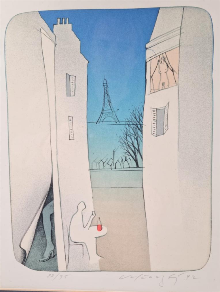 Barevná litografie o rozměrech díla v pastartě 29 x 22 cm, rozměry i s rámem 45 x 35 cm. Rámováno, zaskleno, sigováno v pravém dolním rohu "Velčovský 92", číslováno 88/95.