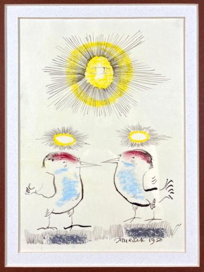 Drobné milé dílo s vtipným námětem. Motivem se stává ptačí dvojice, nad kterou visí svatozář a slunce. Příjemným momentem se stávají paprsky slunce a svatozáře, které jsou v kontrastu s silnými linkami a barevnými plochami. Dílo je symetrické, s vyváženou kompozicí. Kombinovaná technika na papíře, rozměry s rámem 45 x 36 cm, rozměry díla 20 x 14 cm. Signováno vpravo dole "Janeček 1950".