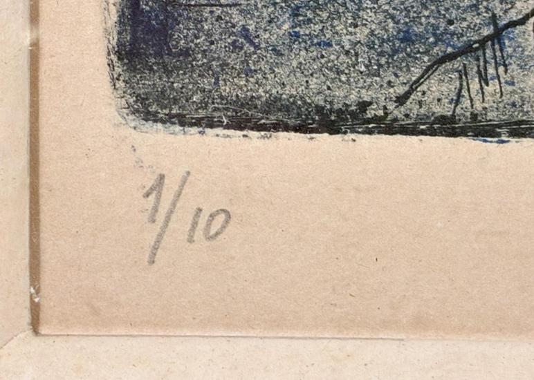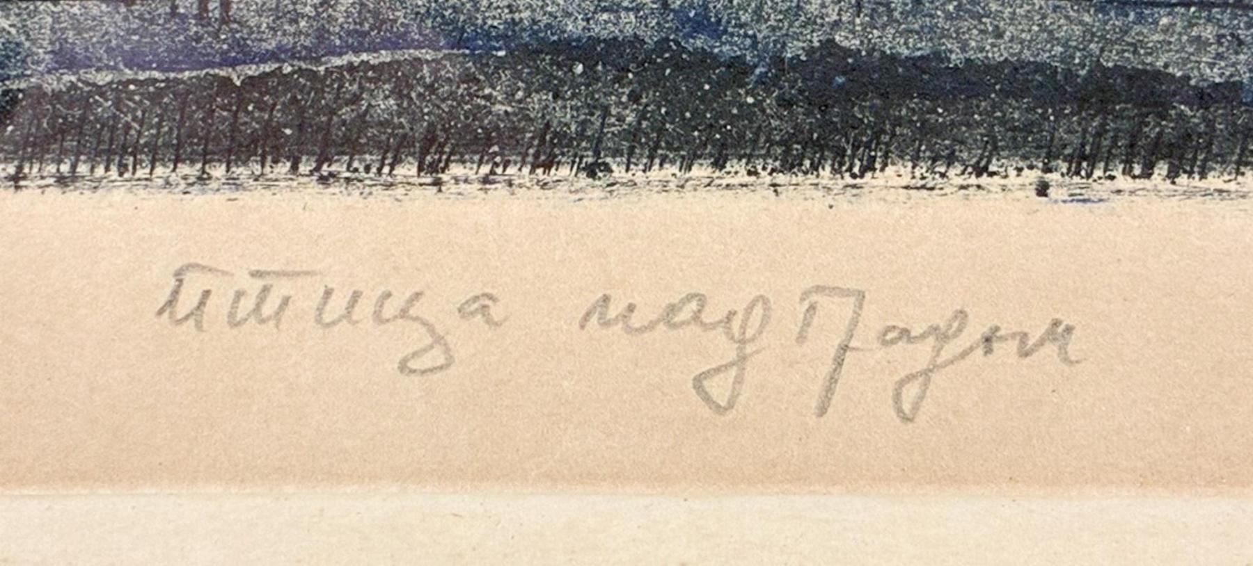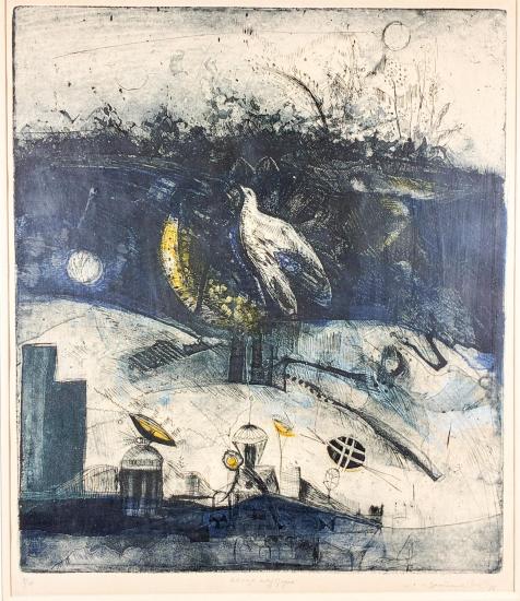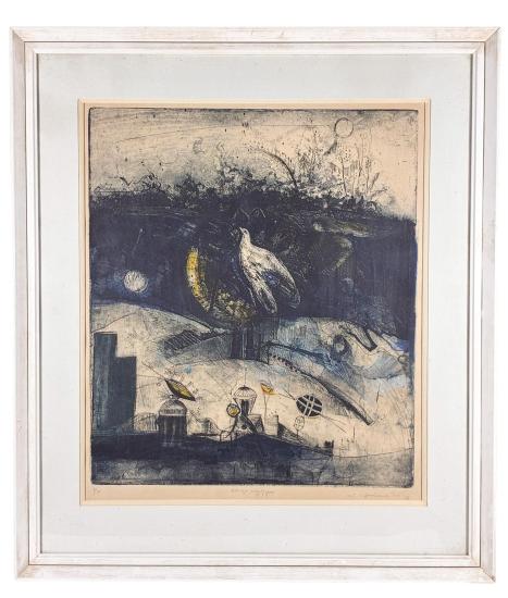 Skvělá grafika s námětem fragmentu města v obložení nebe. Ve spodní části díla se rýsují satelity na střeše, nebe působí, jako by právě přestalo pršet a začínají vylézat první paprsky slunce. V centru vytváří umělec temný pruh za pomocí nahuštěných čar a silného nánosu barvy. Uprostřed vyniká bílý pták. Suchá jehla na papíře, rámováno pod sklem, rozměry s rámem 60 x 69 cm, rozměry díla 41 x 49 cm. Signováno vpravo dole, nerozpoznáno.