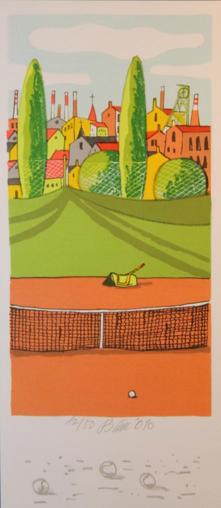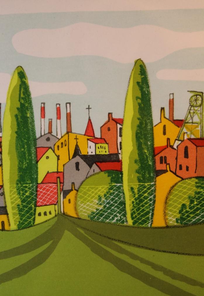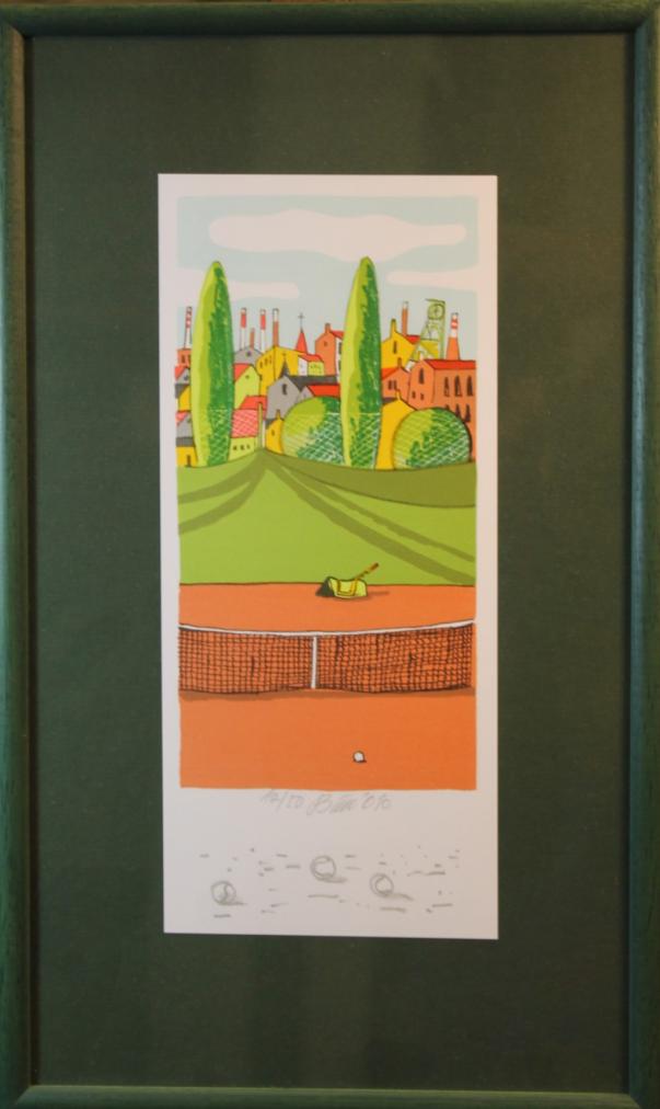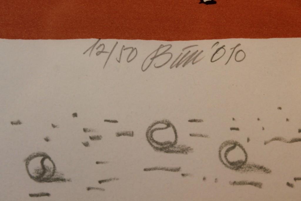 Grafika pod sklem o rozměrech 13 x 29 cm, včetně rámu 25 x 43 cm. Signováno 12/50 Bím 2010, list 12/50.