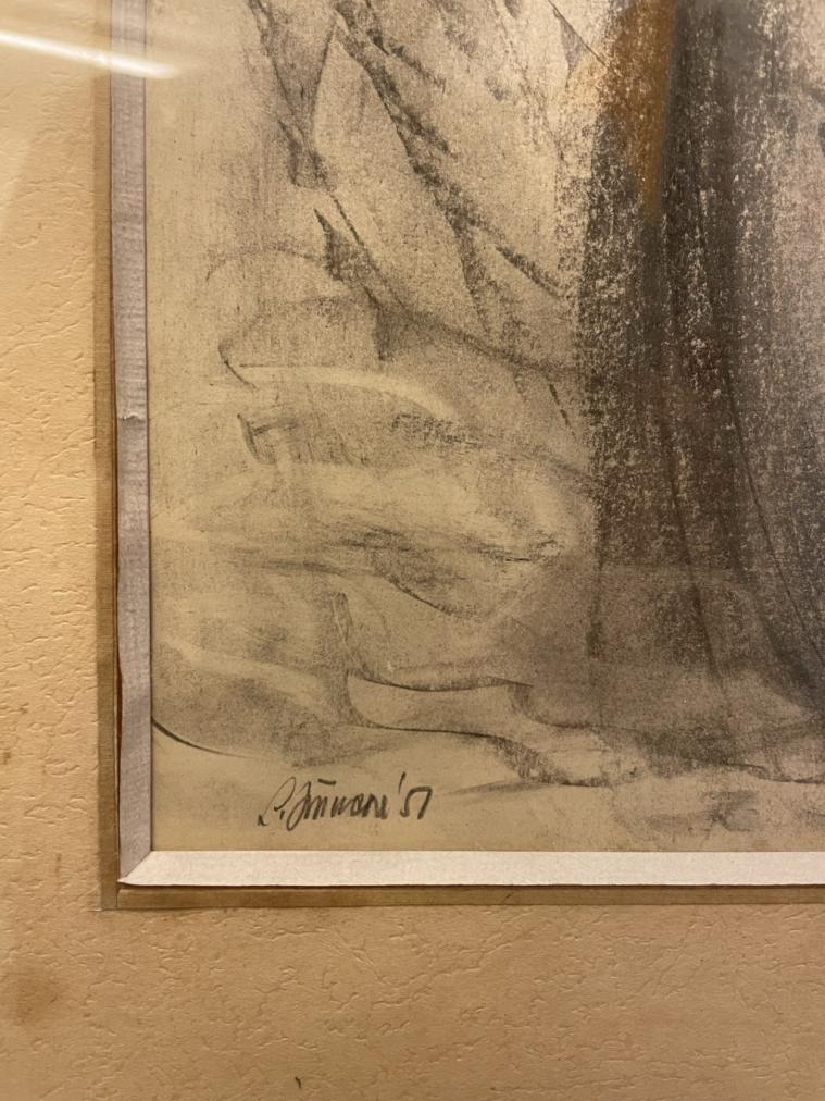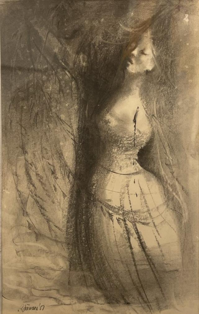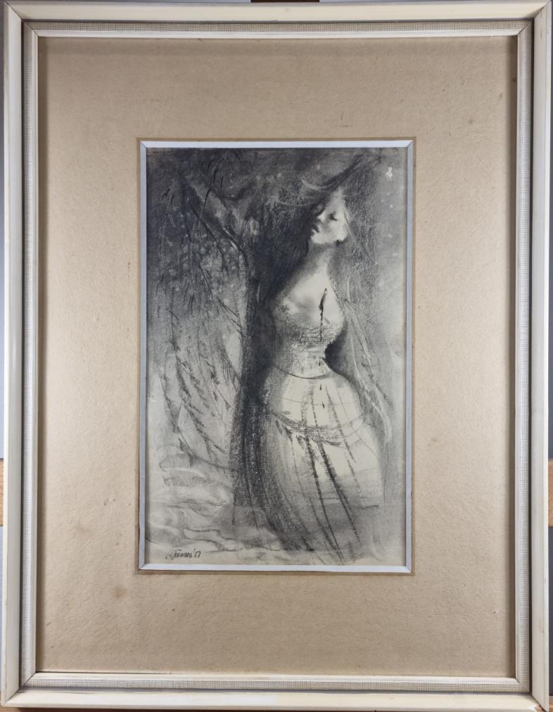 Uhel na papíře pod sklem, rozměr díla 20 x 32 cm, s rámem 40 x 52 cm. Signováno v levém dolním rohu "L. Jiřincová 51".
