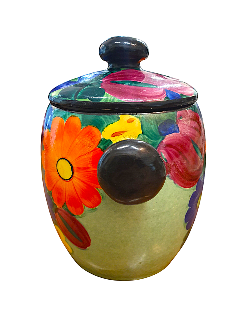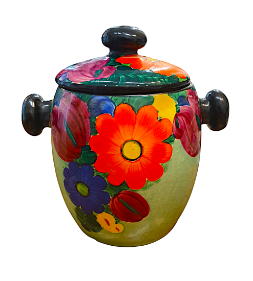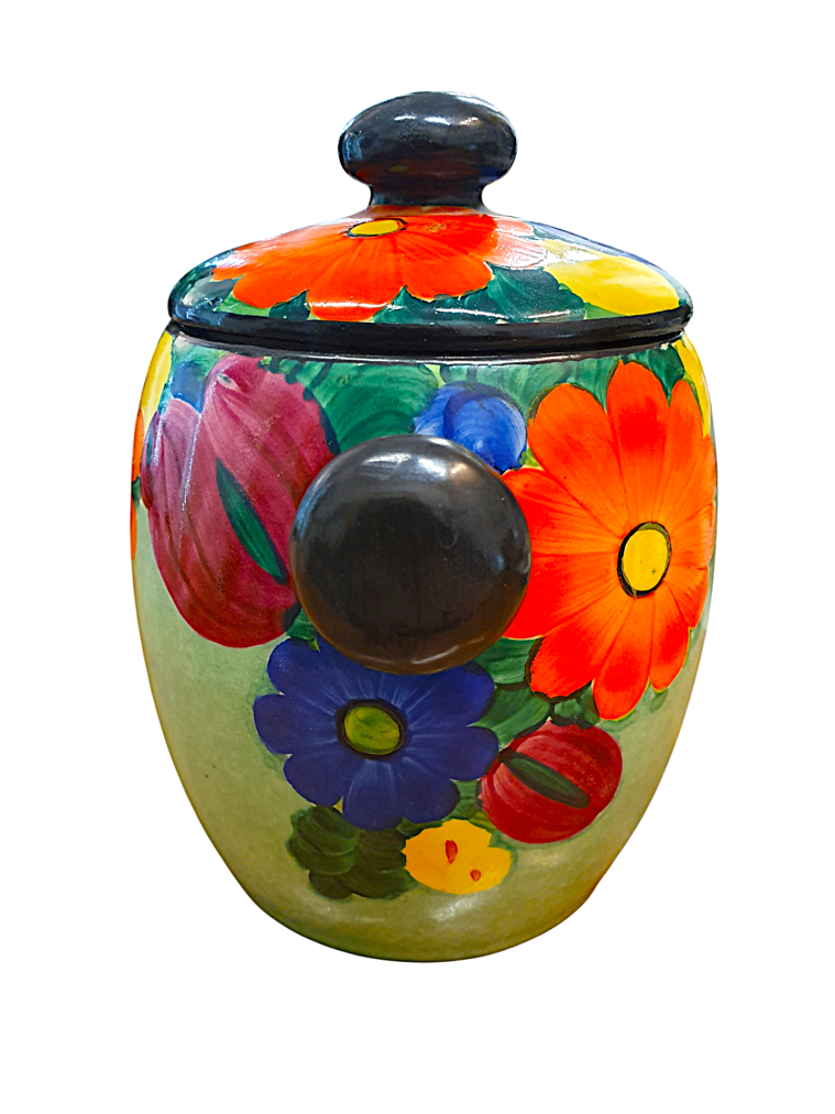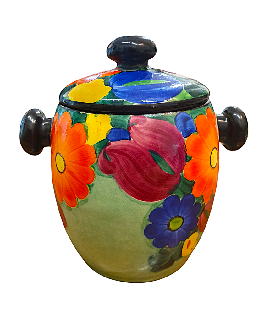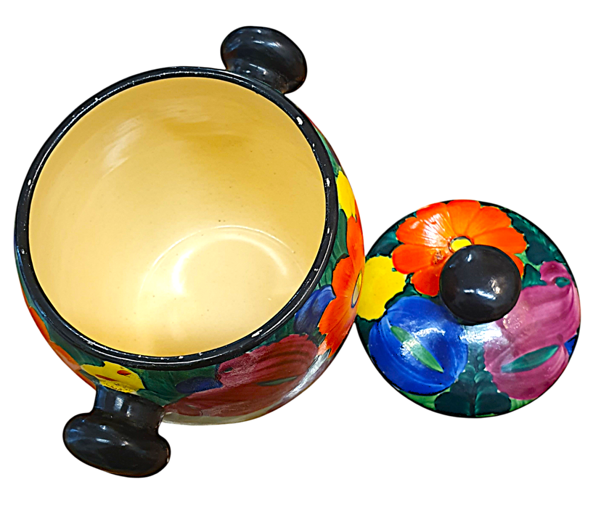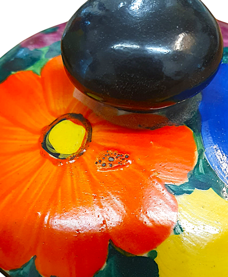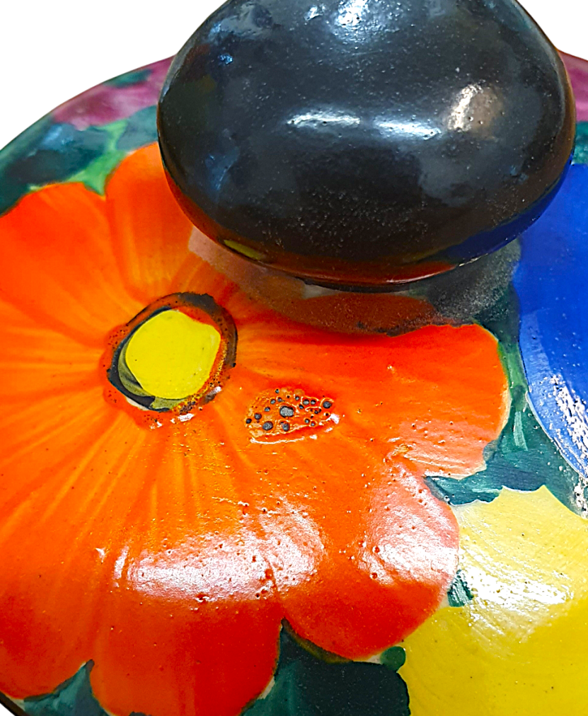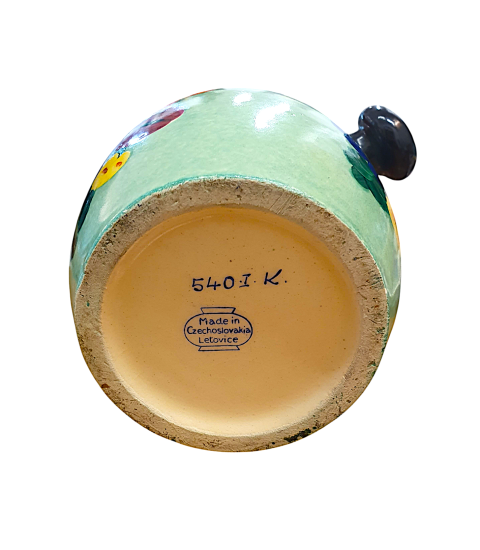 Krásná keramická dóza s pestrým květinovým dekorem. Ručně malovaná nádoba má své kouzlo, originální design florálního zdobení v kombinaci s černými detaily úchytů a lemování vytváří harmonický dojem. Výška včetně víka 15,5 cm, průměr hrdla 9 cm, průměr podstavy 8,5 cm. Značeno vespod - Mde in Czechoslovakia Letovice. Víko má jeden menší oťuk zespod, barva je místy setřená. Na víku chyba barvy - nejspíš vznikla již při výrobě, viz foto.
