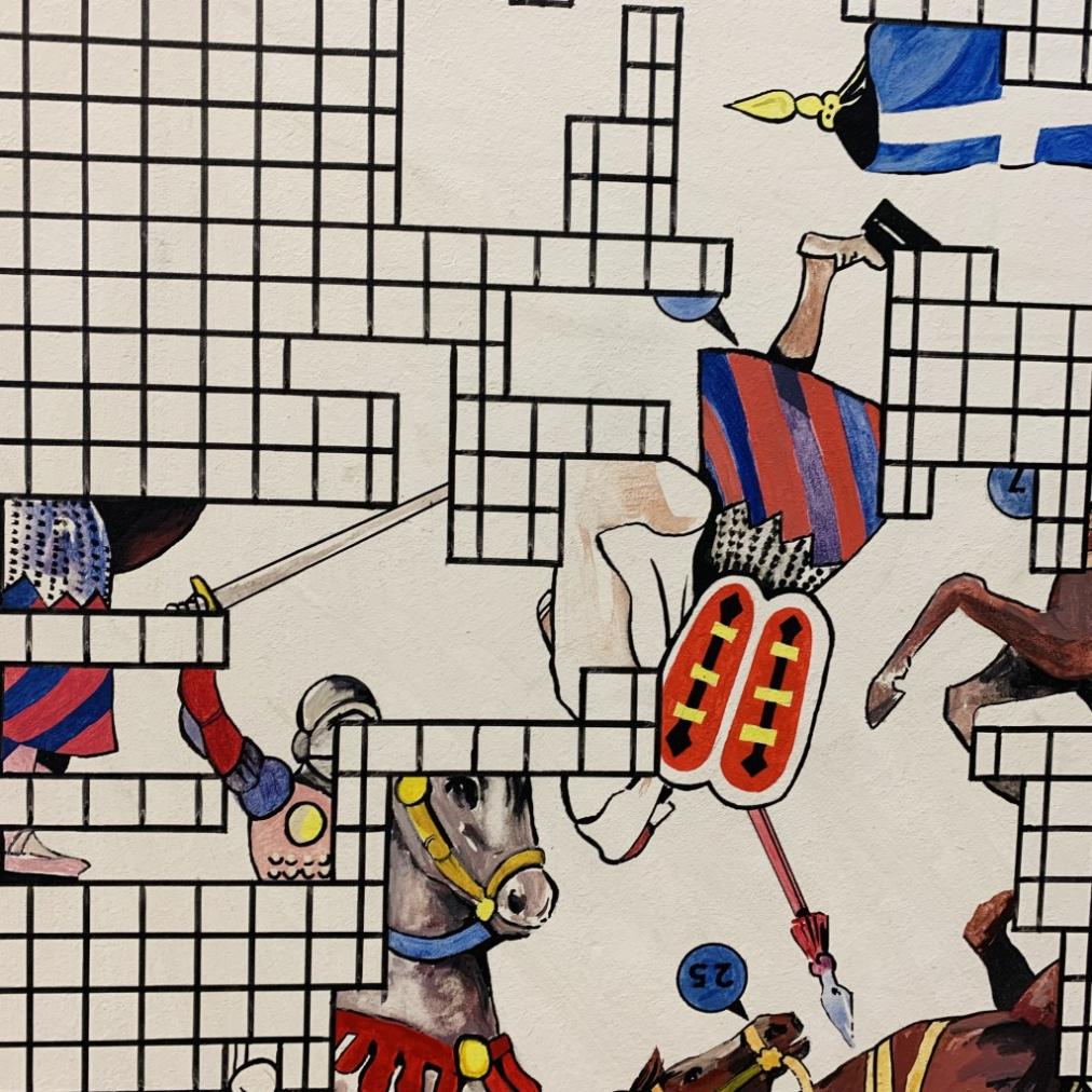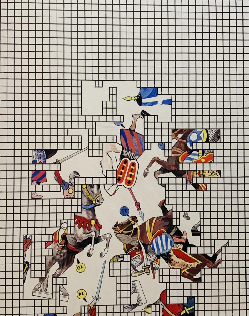 Akryl, olej na sololitu o rozměrech malby 98 x 80 cm, s rámem 108 x 88 cm.