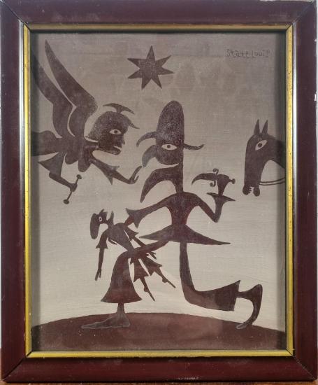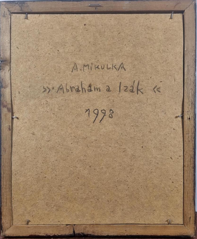 Obraz od Aloise Mikulky s názvem Abraham a Izák. Mikulka z biblického námětu vytvárí výjev, který je typicky komický a lehce pohádkový. Postavy, které vytváří, mají teatrální výrazy, v Mikulkově tvorbě obecně je silně patrný vliv divadelního prostředí. V tomto díle zajímavě kombinuje tmavou malbu na pozadí s gradientem, celý obraz provedený v jednom odstínu různých intenzit. Olej na překližce, rámoáno pod sklem, rozměry s rámem 28 x 23 cm, rozměry díla 24 x 19. Signováno v pravém horním rohu "State Louis" a zezadu "A. Mikulka - Abraham a Izák - 1998". Rám lokálně poškozen.
