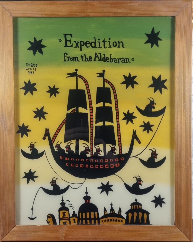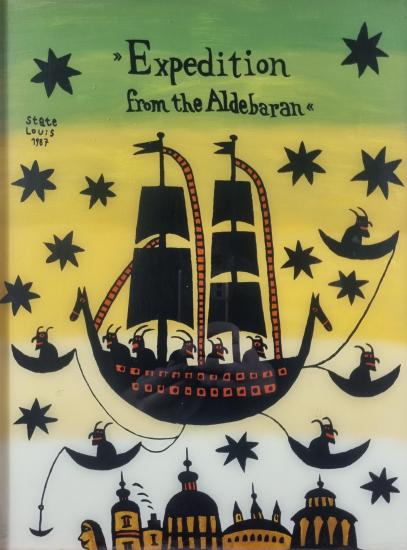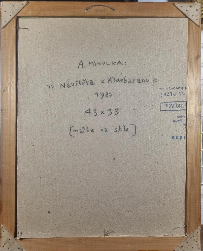 Dílo od Aloise Mikulky s názvem Návšteva z Aldebaranu. Autor vytváří motiv vesmírné lodě, která putuje z hvězdy s názvem Aldebaran (souhvězdí býka). Jeho mimozemšťani se podobají čertům a vznáší se v loďkách nad městem. Mikulka doslovně ilustruje pojem vesmírné lodě, stejně tak i postav s býčími rohy, což dílu dodává vtipnou rovinu. Podmalba na skle, rámováno, rozměry s rámem 49 x 39 cm, rozměry díla 42 x 32 cm. Signováno vlevo nahoře "State Louis 1987", na zadní straně "A. Mikulka - Návšteva z Aldebaranu - 1987 - 43 x 33, malba na skle".
