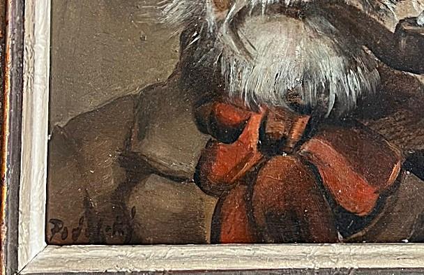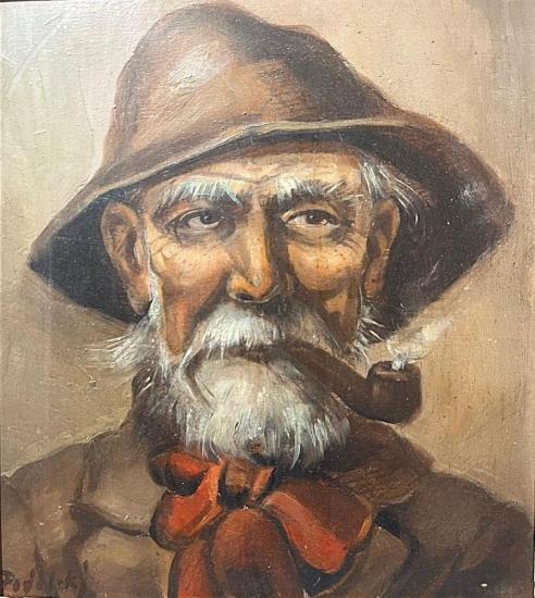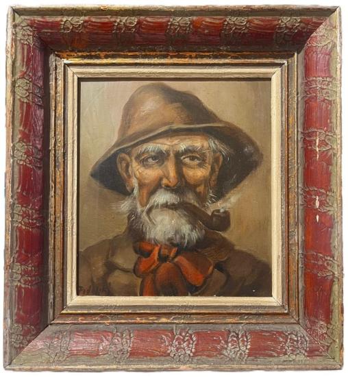Propracovaný a detailně vystínovaný portrét starého muže v klobouku s fajfkou v ústech. Muž má oblečený kabát s červenou vázankou a zamyšleně kouká bokem. Olej na překližce. Zarámováno do masivního rámu, červeno-zlaté barvy. Rozměry díla jsou 25,5 x 23 cm. Rozměry s rámem jsou 39 x 36 cm. Rám má místy odloupnutou barvu. Malba je trochu zaprášená a na povrchu lze vidět tři kapance které stékaly po malbě dolů, malba je nepoškozená. Signatura se nachází na levé straně dole viz foto.