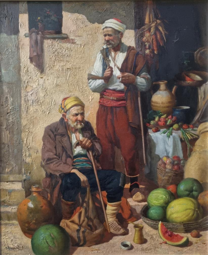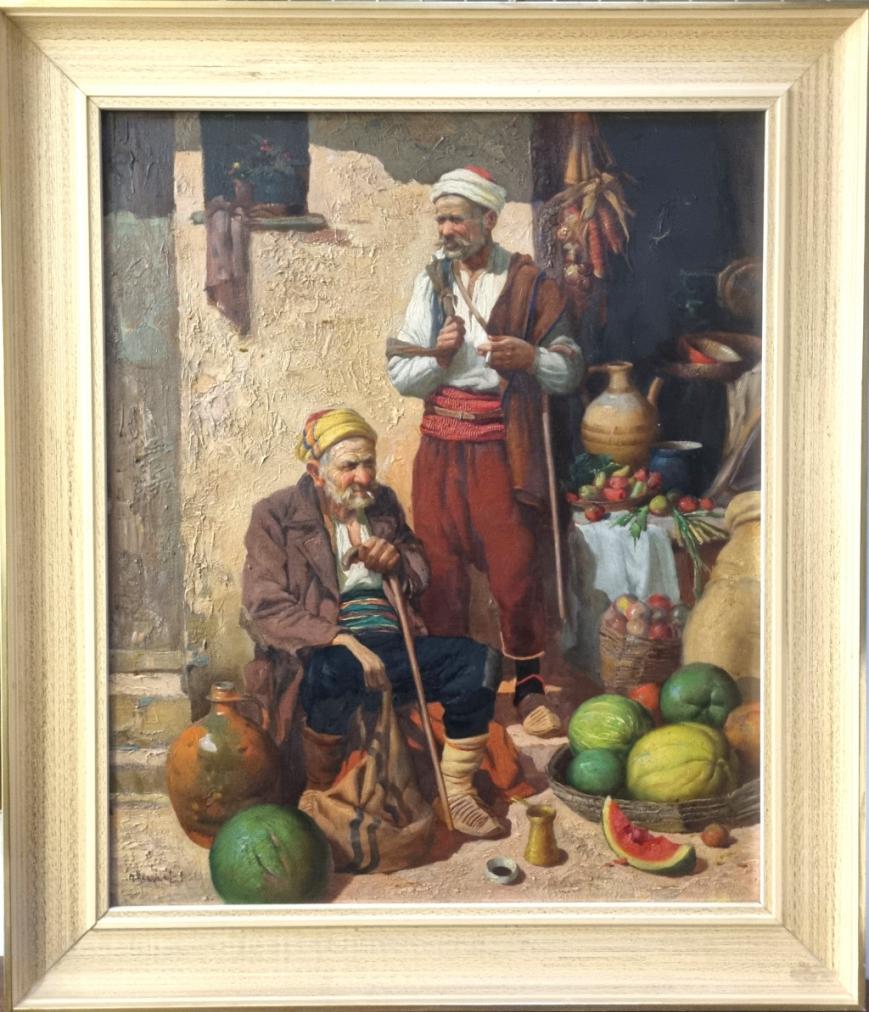 Dílo od výtvarníka Krasického s charakteristickým námětem starých mužů s cigaretou. Umělec spatřuje krásu ve všedních momentech a velmi zdařile je ztvárňuje ve svých malbách. Dva muži sedí na tržnici v obklopení exotického ovoce, které prodávají. Umělec vytváří v místech stěn reliéfní strukturu, čímž vytváří realistický efekt. Olej na plátně, rozměry s rámem 86 x 75 cm, rozměry díla 69 x 57 cm. Signováno vlevo dole "M. Krasický".