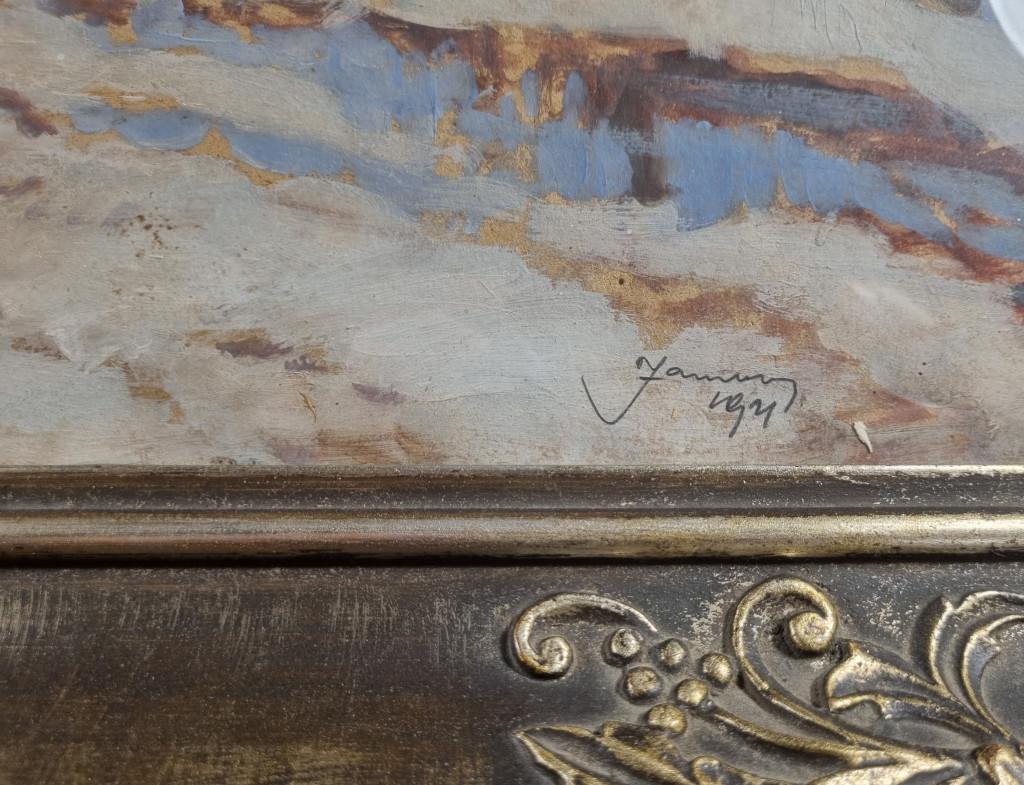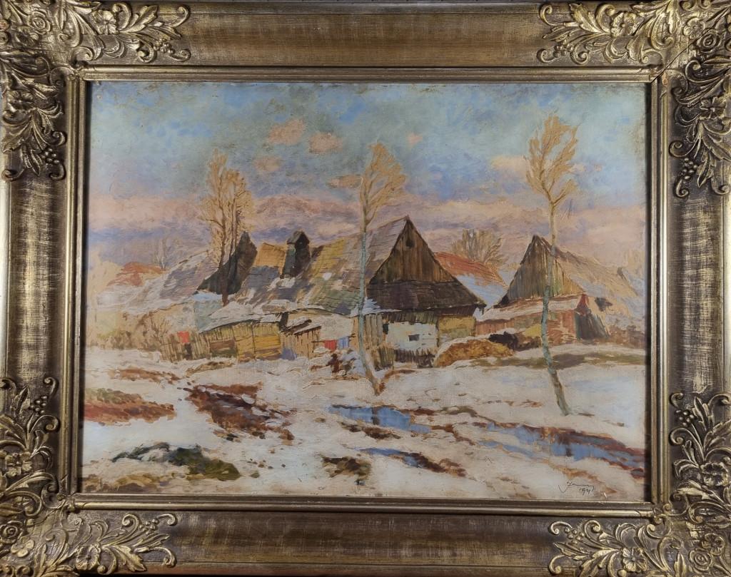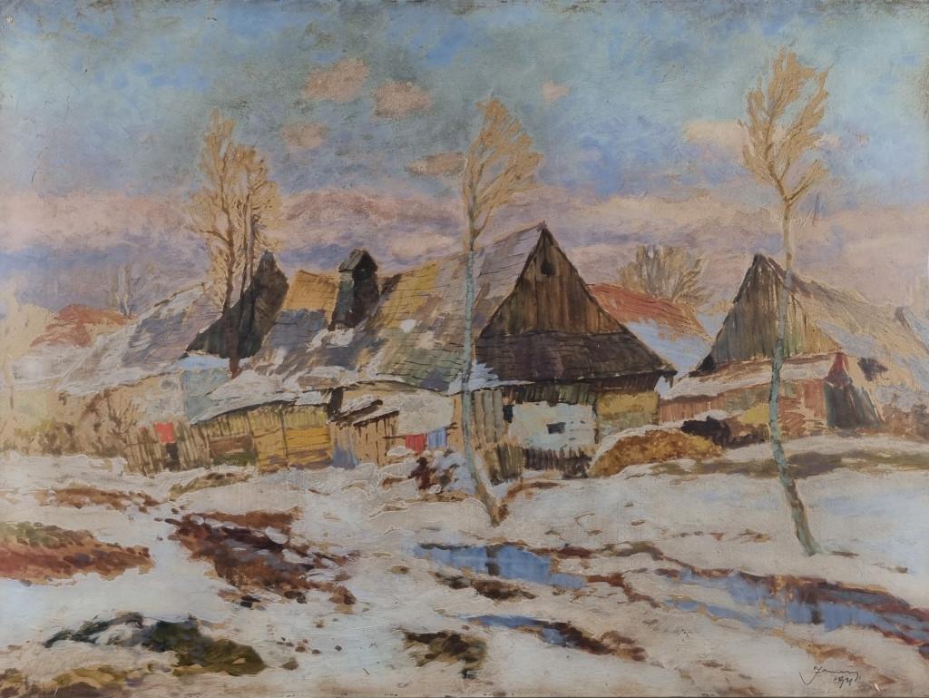 Tento poetický pohled na chalupy v Blatinách, za jednoho mrazivého zimního odpoledne, namaloval akademický malíř a krajinář Josef Jambor ve svých uměleckých začátcích, rok po absolvování Akademie výtvarných umění v Praze. Na šňůrách vidíme pověšené vyprané prádlo, pravděpodobně zmrzlé na kámen, a lesknoucí se led, odrážející kmeny stromů. Malba má rozměry 61 cm na šířku x 45 cm na výšku, rozměry s rámem jsou 80 cm na šířku x 59 cm na výšku. Olej na kartonu, zarámováno pod sklem. Signováno v pravém dolním rohu Jambor 1921.