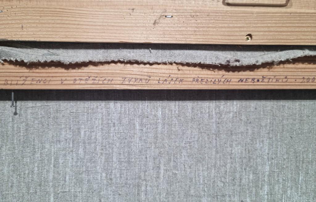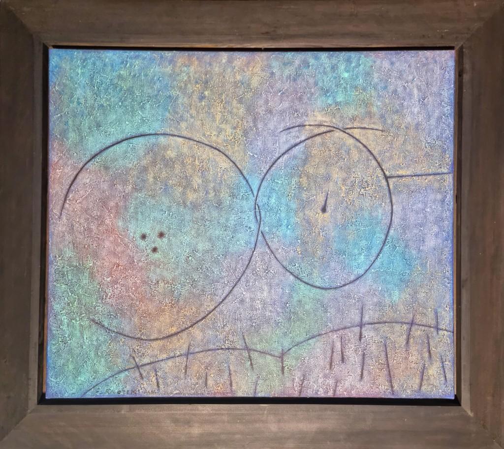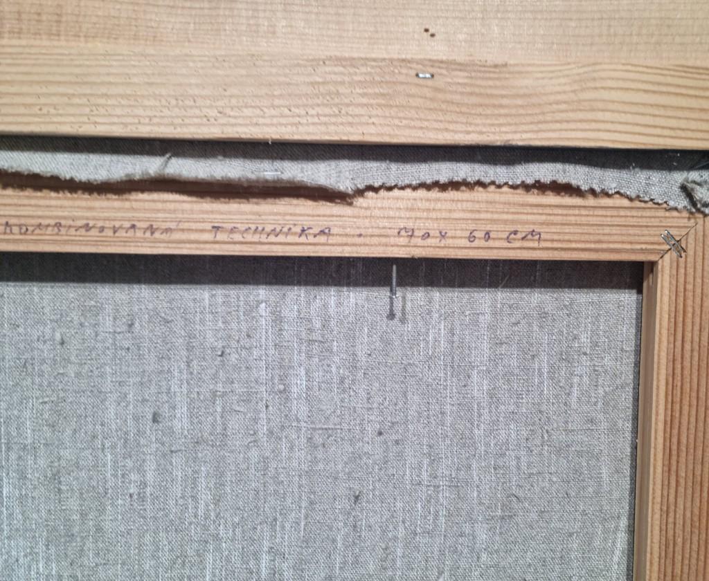 Obraz kombinovaná technika na plátně o rozměrech malby 70 x 60 cm, rám 88 x 80 cm, signováno Knotek, na zadní straně popis ,,Blíženci v otěžích zvyků lásek přežilých nebožtíků.