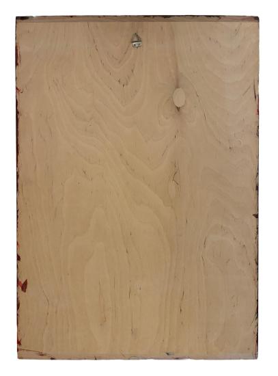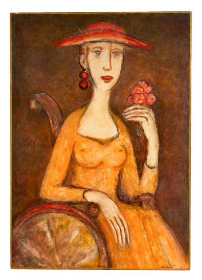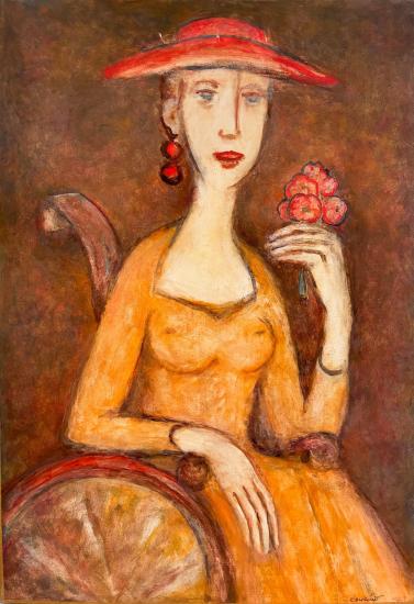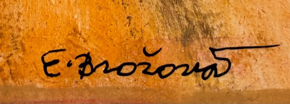 Portrét štíhlé ženy se zasněnýma očima, která v rukou drží květinu. Dílo od akademické malířky a sochařky Evy Brožové. Olej na sololitu. Rozměry jsou 50 x 71 cm. Signatura se nachází na pravé straně dole E. Brožová.