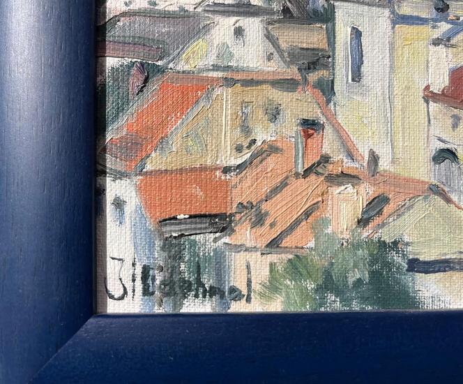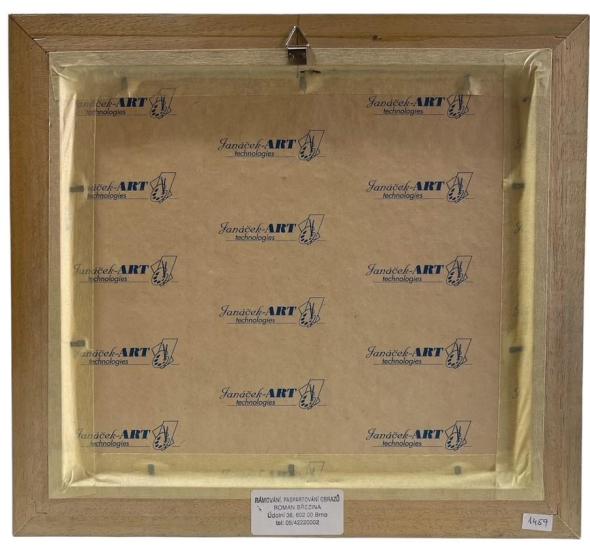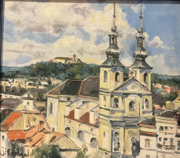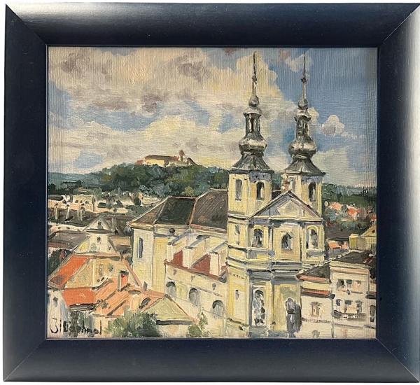 Malba brněnské scenerie s pohledem na hrad Špilberk a kostel svatého Michala v popředí obrazu. Olej na sololitu, zarámováno do modrého dřevěného rámu. Rozměry díla jsou 24 x 21 cm, rozměry s rámem jsou 31 x 28 cm. Signatura se nachází na levé straně dole, viz foto.