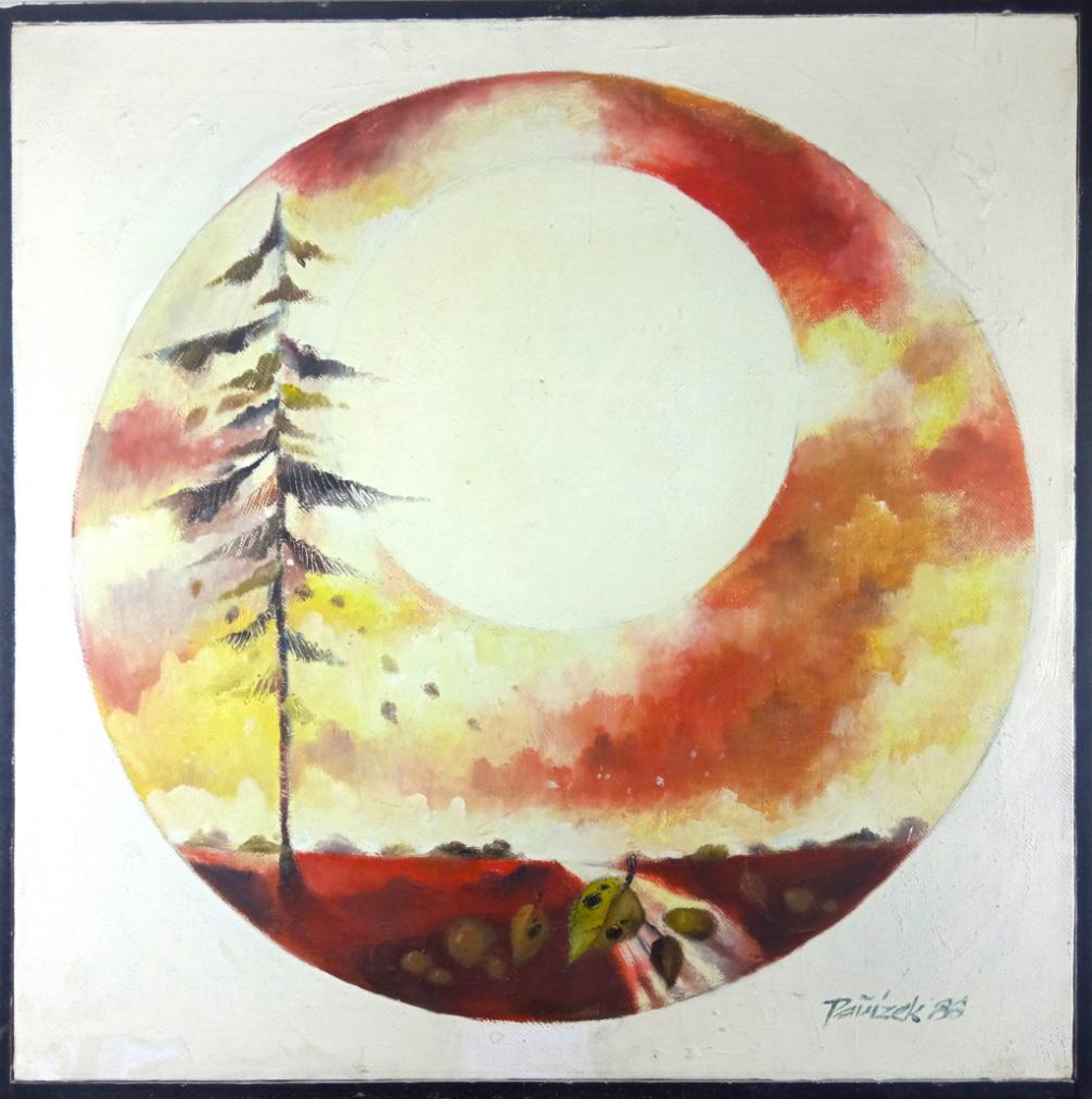 Malba malíře Jana Pařízka zobrazuje západ slunce nad krajinou. Obraz je zpracován technikou akrylu na plátně a rámován v jednoduchém úzkém dřevěném rámu. Signatura autora s datací obrazu je v pravém dolním rohu malby Pařízek. Na zadní straně rámu se nachází tisk s iniciály autora.