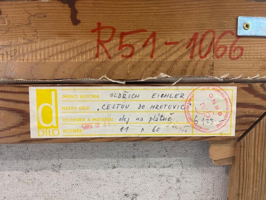Abstraktní dílo Oldřicha Eichlera z roku 1985 připomíná klidnou krajinu v mlžném oparu. Signatura - značka O vlevo nahoře + na zadní straně malby autorský štítek. Olej na plátně je zasazen v jednoduchém dřevěném rámu, podtrhujícím krásu a klidnou atmosféru obrazu. Rozměr malby je 81 x 60 cm, rozměr rámu je 95 x 75 cm.