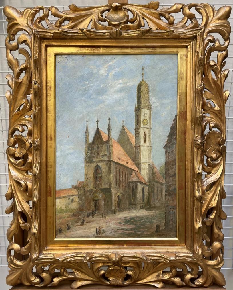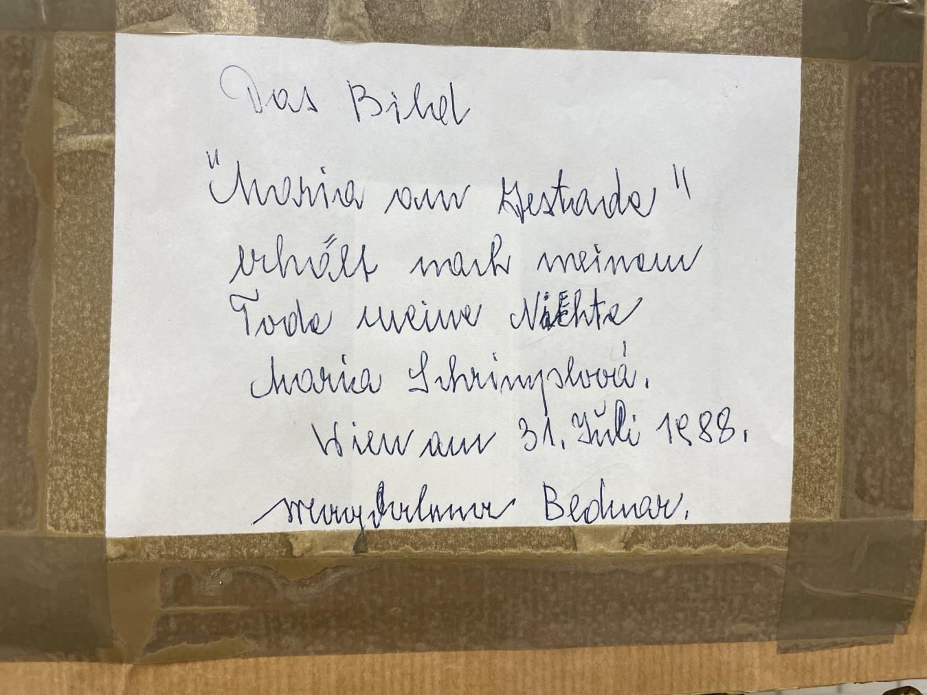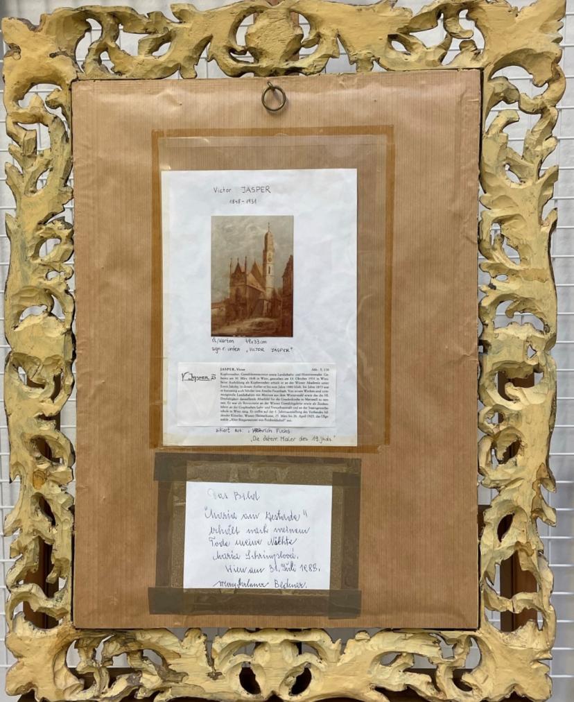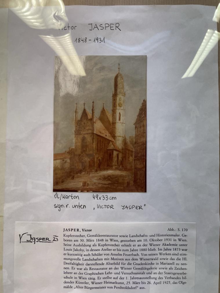 Olej na kartonu o rozměrech malby: výška 49 cm šířka 33 cm , včetně rámu výška 77 cm, šířka 60 cm. Lokálně poškozeno- vypadaná barva . Signováno v pravém spodním rohu Jasper.