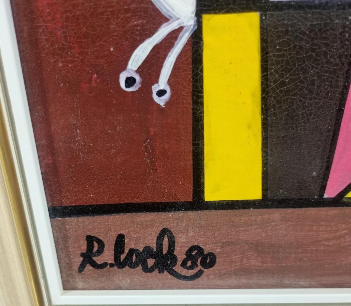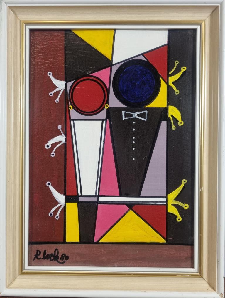 Dílo od autora Cooka s námětem dvou figur. Umělec vytváří vlastní stylizaci, která čerpá z geometrických tvarů, ty vyplňuje různě barevnými, pestrými plochami. Dílo doplňují živější, organičtější detaily a vytváří tak v malbě zajímavé momenty. Olej na desce, rozměry s rámem 31 x 42 cm, rozměry díla 34 x 24 cm. Signováno vlevo dole "R. Cook 80"