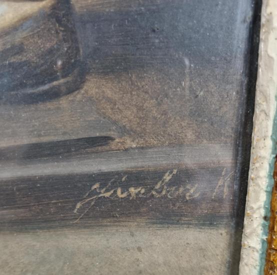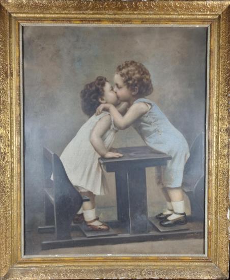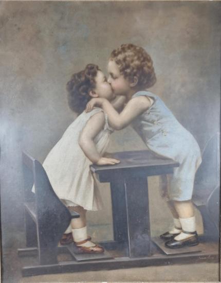 Žánrová malba od malíře Jambor K. vyzobrazuje scénu z temnější místnosti, kdy se dvě naklání přes malý stoleček a dávají si polibek. Stůl a k němu připevněné židle připomínají školní lavici. Jedno dítě má na sobě bílé šatičky a druhé modré proužkované lacláče s knoflíky. Obraz je signovaný v pravém dolním rohu a zarámovaný pod sklem. Rám je pozlacený a má strukturu s pár krajními oděrky. Rozměry rámu jsou: 65 cm x 78 cm i s rámem.