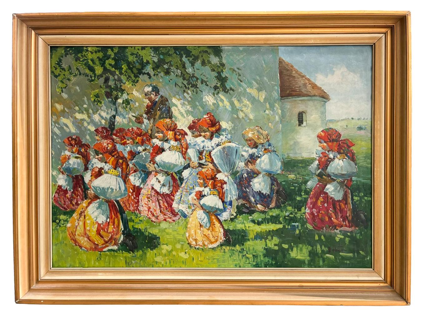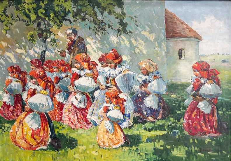 Žánrová malba z prostředí Slovácka. Církevní pouť ke kapličce je krásně a příjemně prosvětlena skrz paprsky stromů a dodává obrazu letní nostalgii. Obraz je signovaný v pravém dolním rohu. Rozměry s rámem jsou 105 x 78 cm a bez rámu 90 x 62 cm. K obrazu je ..Záruční list,, od autora, vytvořen v březnu roku 1941.