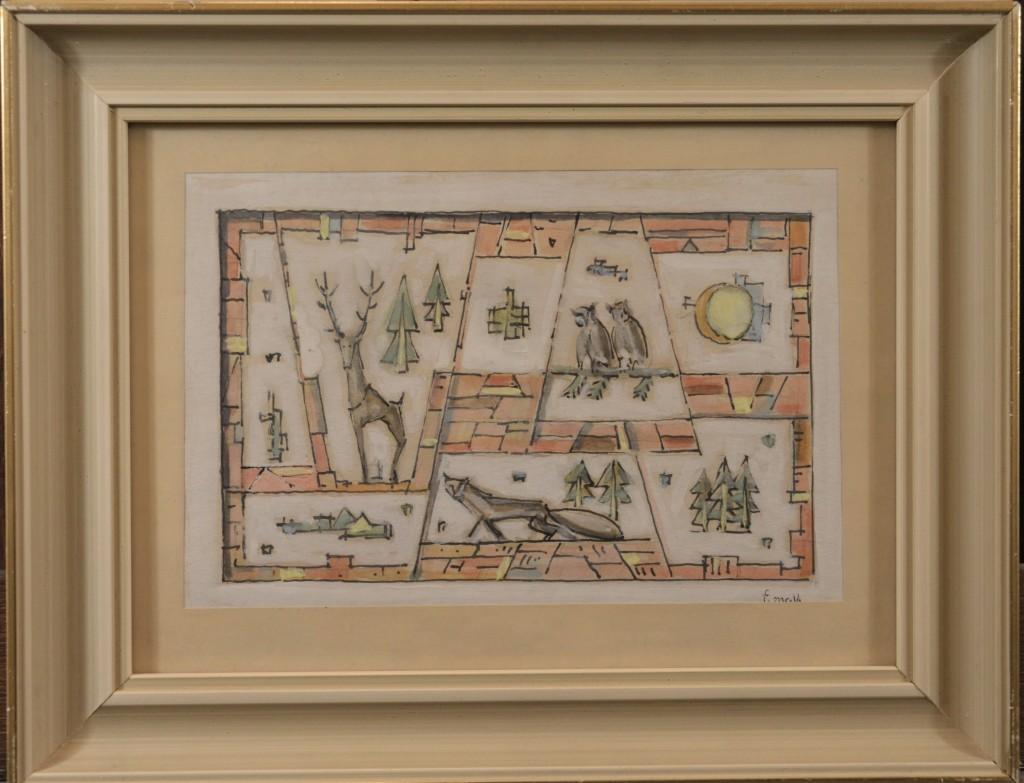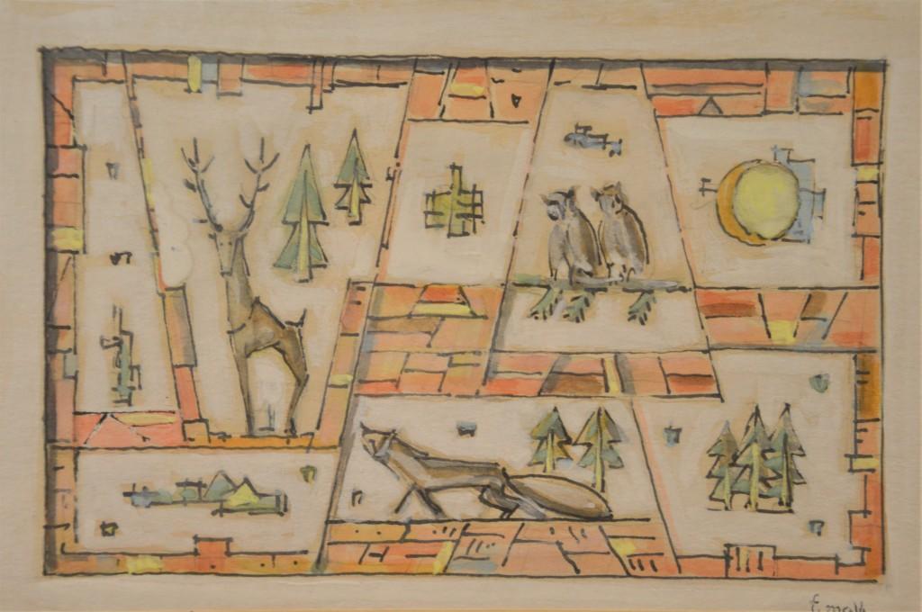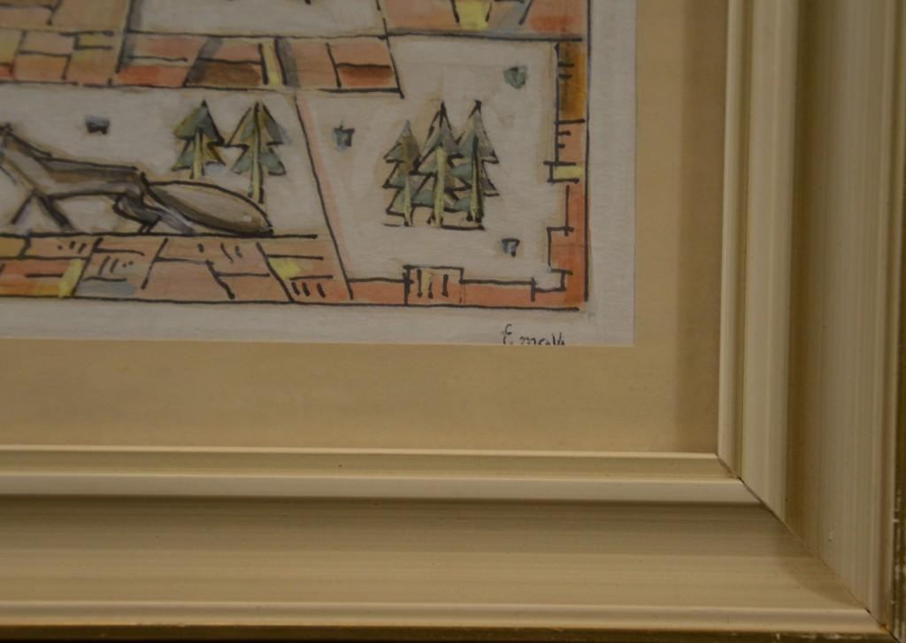 Obraz kombinovaná technika o rozměrech bez pasparty 22 x 14,5 cm, včetně rámu 33 x 26 cm. Signováno F. Malý, autor dílo vytvořil pro děti sousedů v Brně.