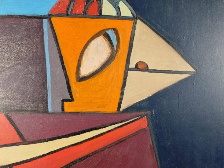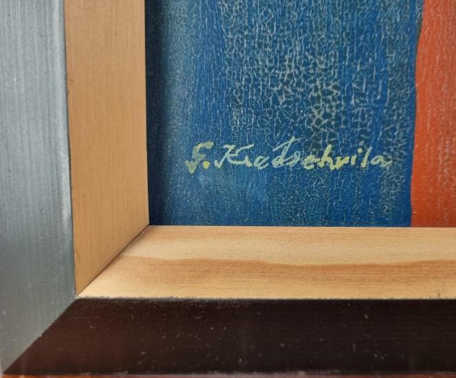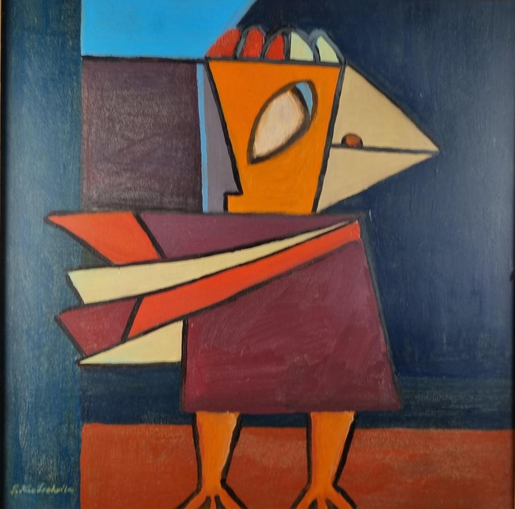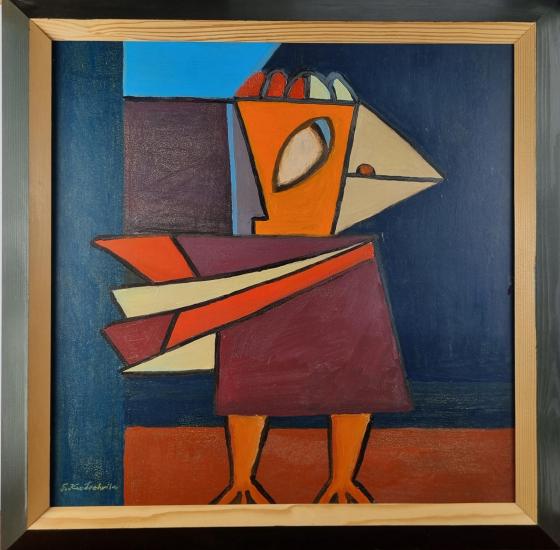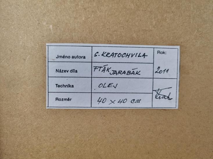 Obraz od českého malíře Stanislava Kratochvíla zobrazující geomtericky zpracovaného ptáčka. Obraz je v dřevěném rámu s obdobně laděným zpracováním jako je samotná malba. Jedná se o temperu na kartonu se signaturou v dolném levém rohu S. Kratochvila. Rozměry malby 40 x 40 cm s rámem jsou 47 cm x 47 cm. Na zadní straně autorský štítek.