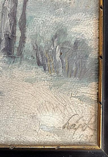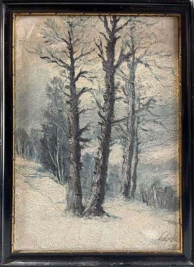 Malba zimní krajiny v chladivých tónech, s tajemnou atmosférou lesa v podvečer. Olej na sololitu, zarámováno do dřevěného rámu. Rozměry díla jsou 34 x 24 cm, rozměry s rámem jsou 38 x 28 cm. Rám je lokálně poškozen, v barvě se nachází praskliny a její povrch je zanešený tenkou vrstvou prachu. Na pravé straně dole se nachází signatura Hájek 1951 viz foto.