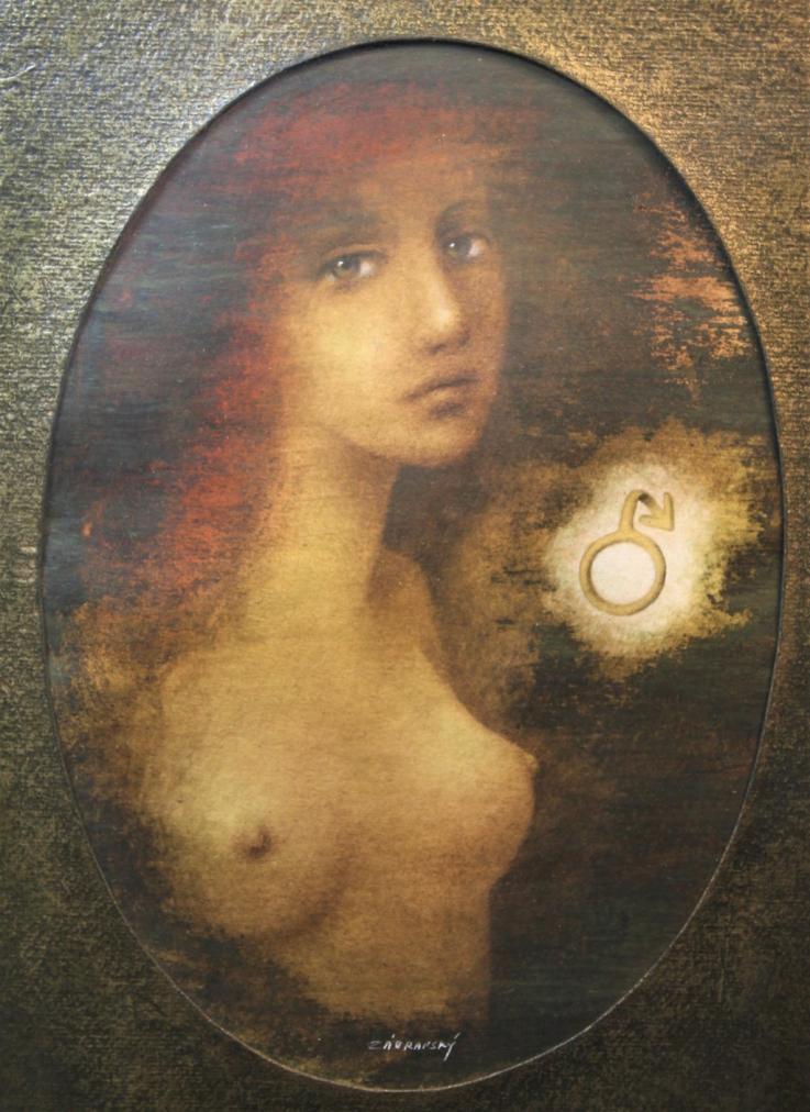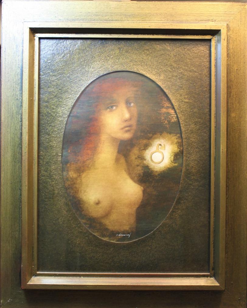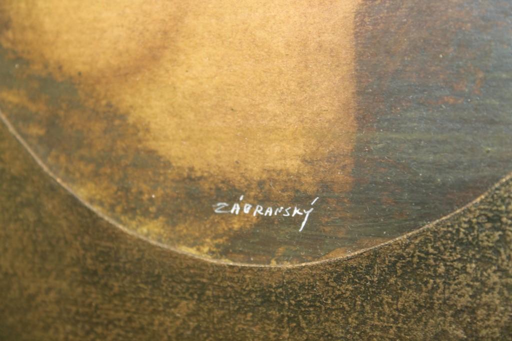 Obraz - kombinovaná technika pod sklem v paspartě o rozměrech, na výšku 30 cm na šířku 20 cm, včetně rámu 41 x 51 cm. Signováno Zábranský.