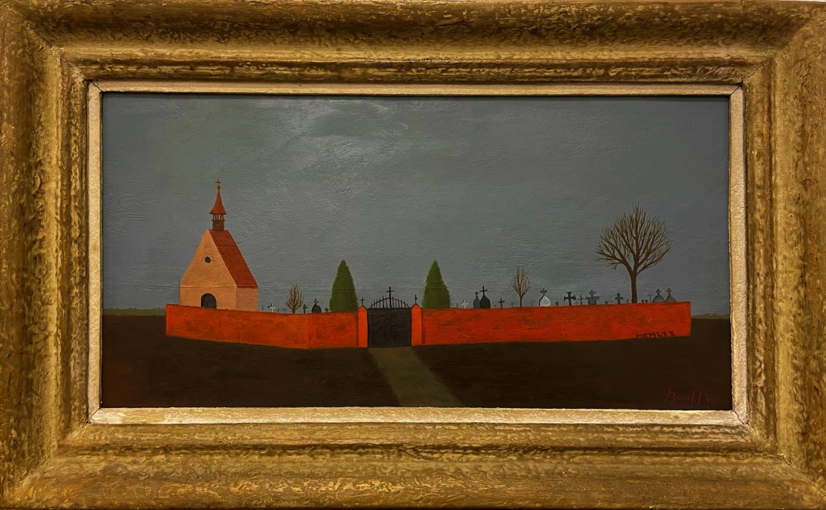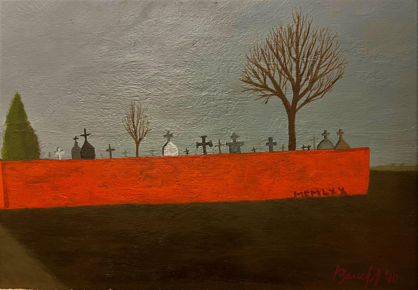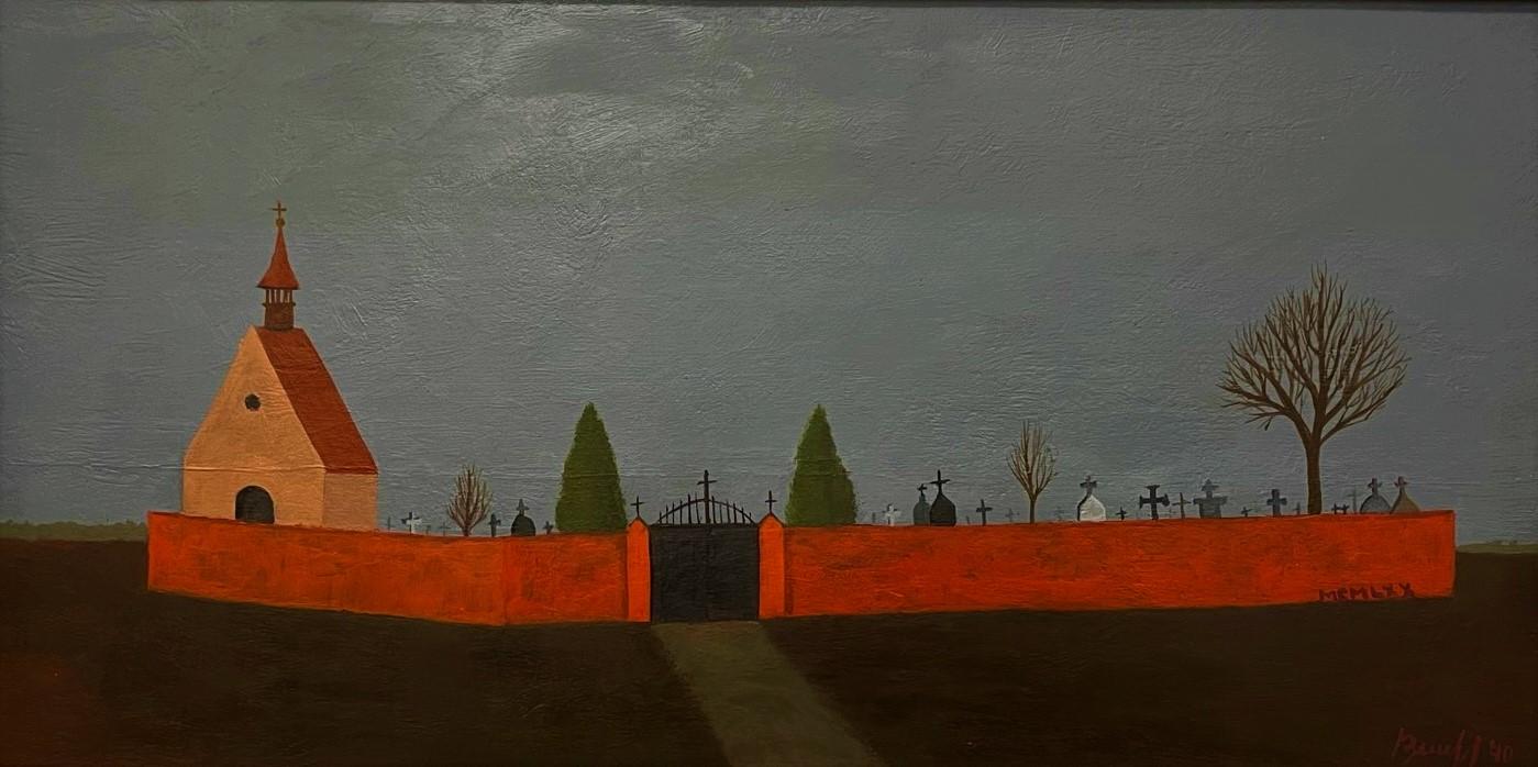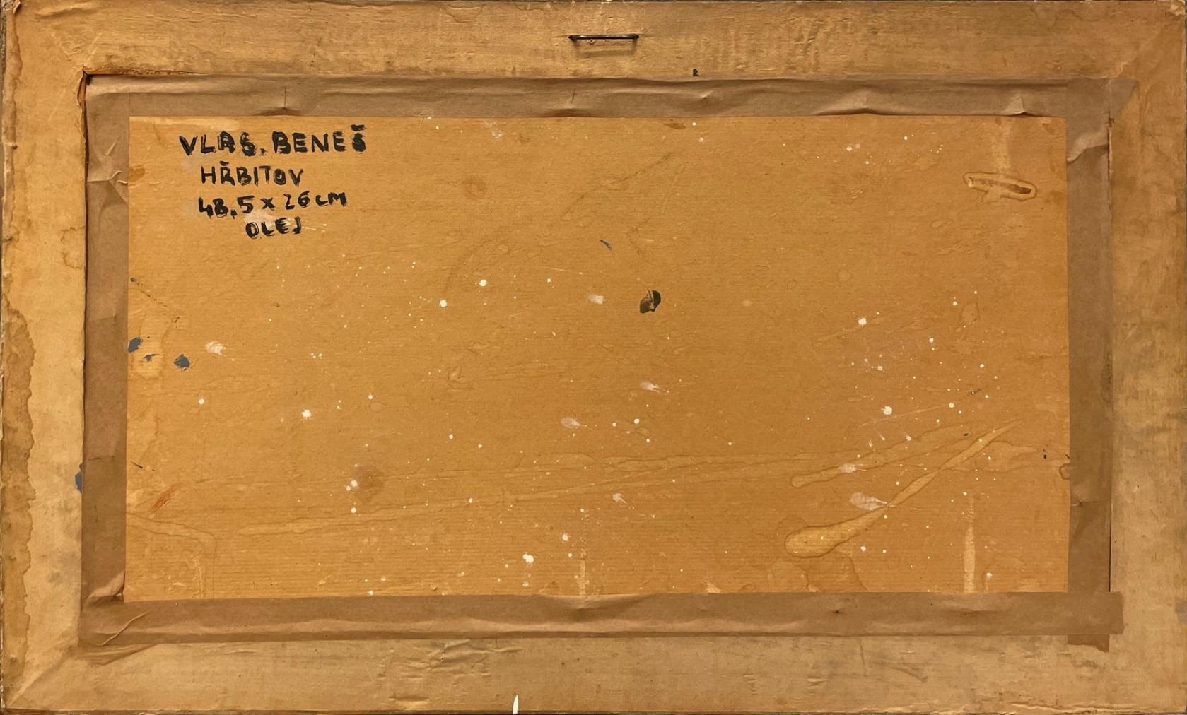 Rozměr díla 48,5 x 26 cm, včetně rámu 57,5 x 35 cm, olej na překližce, na hřbitovní zdi vyobrazeno datum 1970 - MCMLXX, signováno v pravém dolním rohu "Beneš 70".