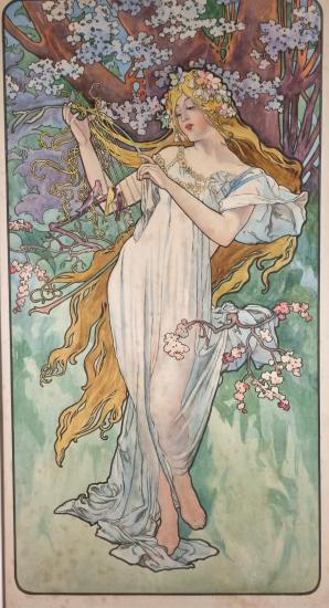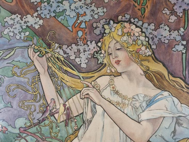 Kopie slavného obrazu z cyklu ročních období od Alfonse Muchy. Mucha vytvářel výsostně secesní díla, využíval tedy především vizuální jazyk spojený s ornamentem, který čerpá s tvarů a forem nacházejících se v přírodě. To propojuje s ženskými postavami a hledá paralely. Akvarel na papíře, rámováno pod sklem, rozměry s rámem 103 x 64 cm, rozměry díla 80 x 42 cm. Nesignováno.