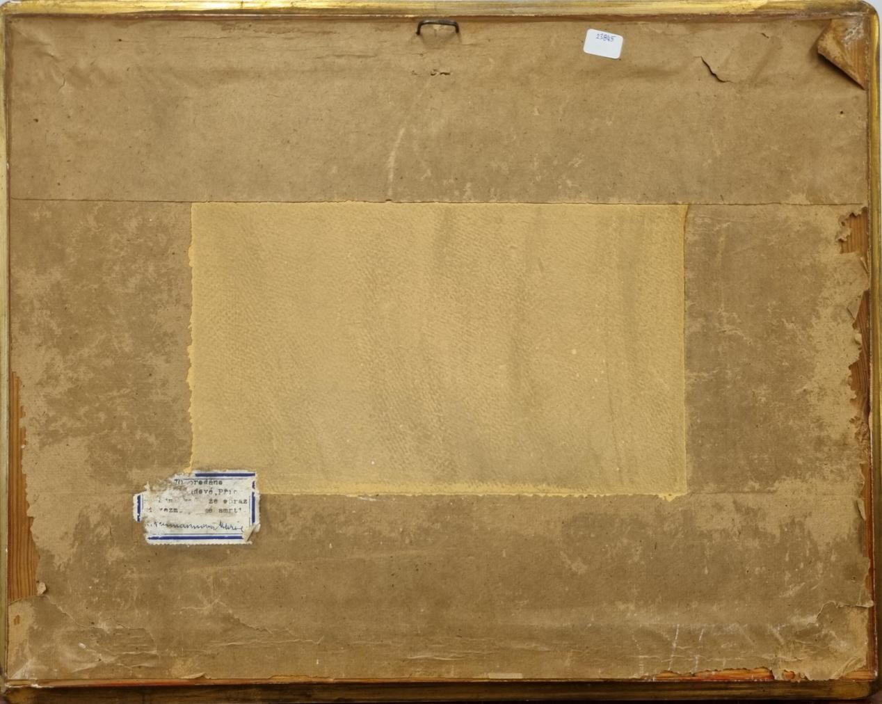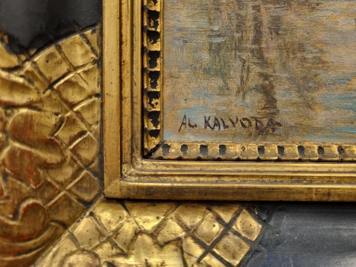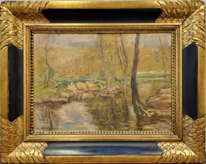 Obraz od autora Aloise Kalvody s pohledem do krajiny, kterou protéká řeka. Autor vytváří krásnou podzimní atmosféru, v hladině se zrcadlí stromy tyčící se po okraji, odraz zdobí jemné odlesky. V pozadí se rozprostírají lesy, které podzim zbarvil do žlutých odstínů. Olej na lepence, rámováno, rozměry s rámem 48 x 38 cm, rozměry díla 35 x 25 cm. Signováno vlevo dole "Al. Kalvoda".