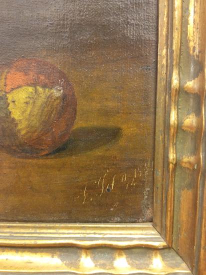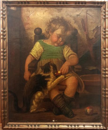 Nádherná malba s originálním a vtipným motivem. Spící děvčátko má v klíně koláč, na kterým si právě pochutnává kočka. Realistické zpracování se dokonale spojuje s vtipným námětem obrazu. Olej na plátně, 2. polovina 19. století, rozměr malby 44 x 54 cm, rozměr s rámem 51 x 61 cm. Signatura nečitelná. Na povrchu malby krakelace.