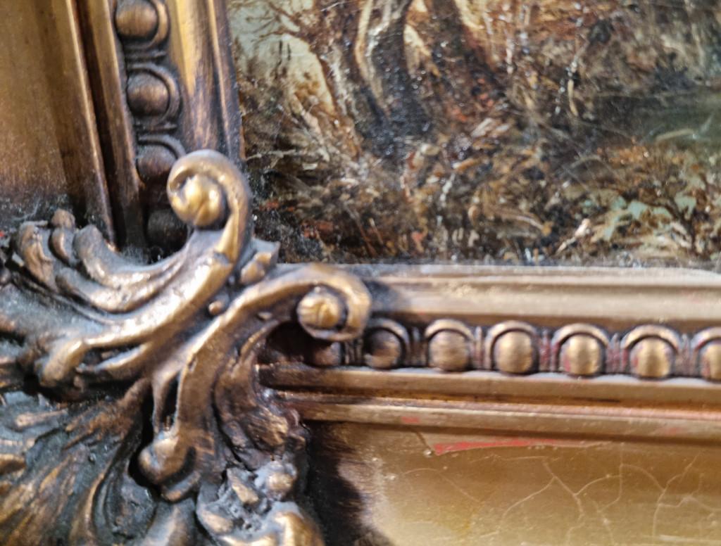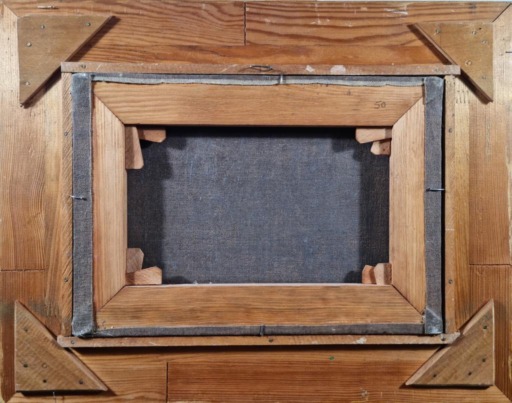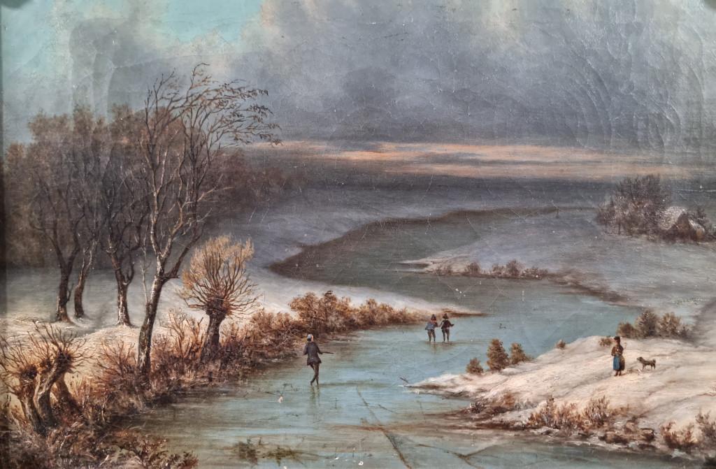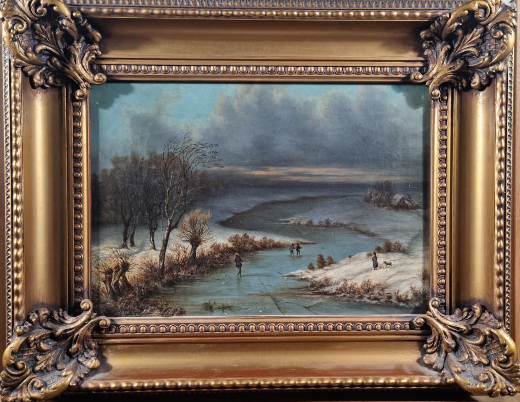 Nádherná detailní malbička zamrzlé řeky, na které bruslí děti a dospělá žena. Řeka se vine do tmavých míst zimy, až splývá s horizontem. Přední část obrazu osvěcují zimní paprsky slunce, na břehu zimní radovánky sleduje dívka s psíkem. Olej na plátně, rozměry s rámem 49 x 38 cm, rozměry malby 33 x 22 cm, patrná krakelace povrchu malby, rám v pravém horním rohu poškozen. Signováno vlevo dole Wutzwiborger.