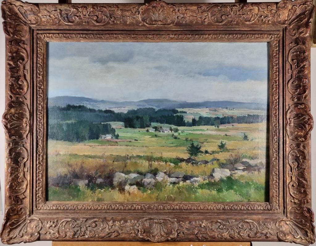 Dílo od našeho předního krajináře Jambora. Na mlžném horizontu se rýsují kopce a vrchy, které pokrývají lesy. V předním plánu leží hromádka kamení. Jambor mistrně zobrazuje krajinu se všemi jejími krásami, střídá rozmazané travnaté plochy s pečlivou malbou stébel. Olej na plátně, rozměry s rámem 90 x 70 cm, rozměry malby 68 x 50 cm. Signováno vpravo dole "Jambor 1952".