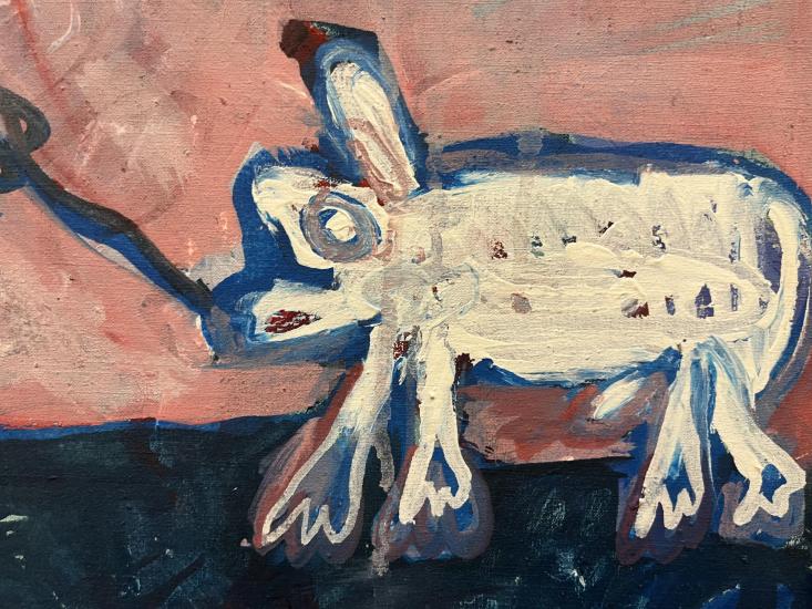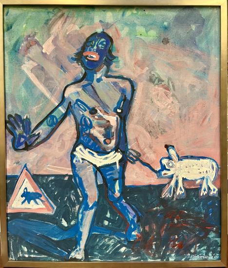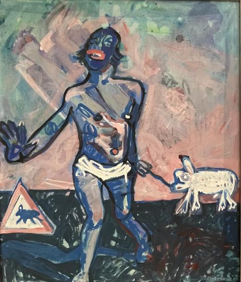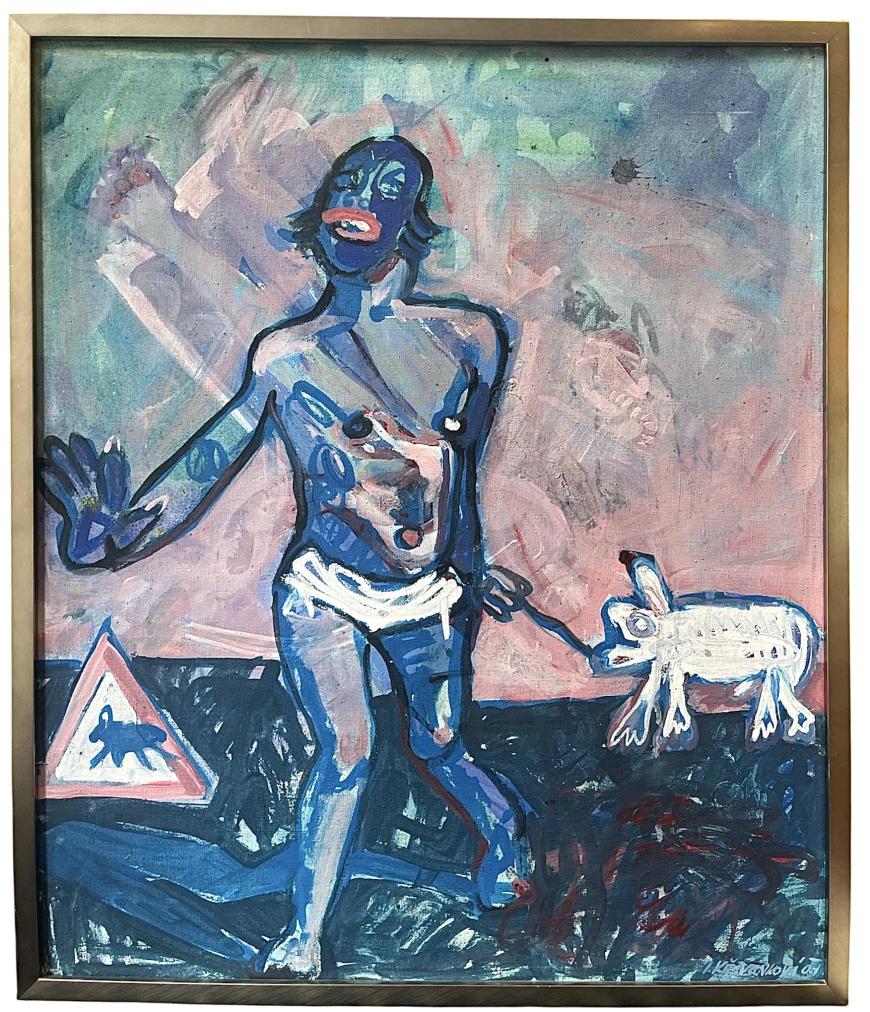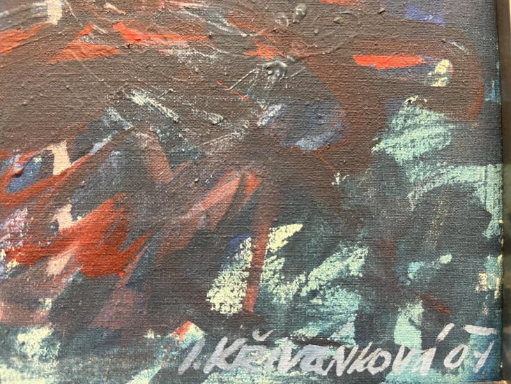 Dílo od umělkyně Křivánkové, která studovala u ikonického českého malíře Načeradského.i. Křivánková pracuje s vlastní stylizací, chaotickými tahy i vrstvením motivů přes sebe. Olej na plátně, rámováno, rozměry s rámem 67 x 57 cm, rozměry díla 64 x 54 cm. Signováno vpravo dole "Křivánková 01".