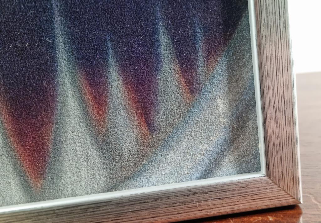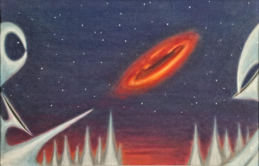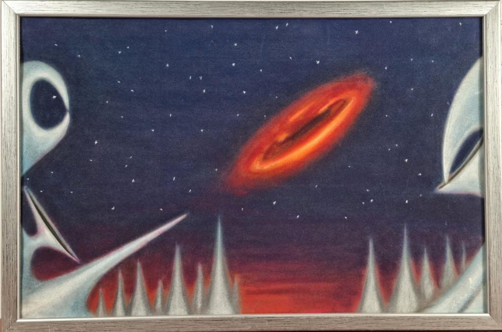 Typické dílo od autora Kurovského. Zvolený velur zde hraje velkou roli, díky matnému materiálu působí vesmírný prostor velmi uvěřitelně. V dáli se rozprostírá černá díra a náš pohled je ohraničený kovovými trny a výstupky, které ladí s kovovým efektem na rámu obrazu. Kurovského náměty mají často lehce apokalyptický náboj. Kombinovaná technika na veluru, rozměry s rámem 48 x 32 cm, rozměry malby 44,5 x 28,5 cm. Signováno vpravo dole "Kurovský".