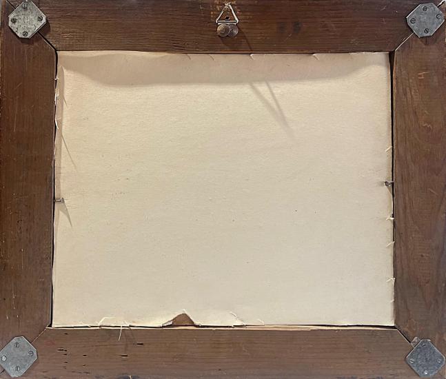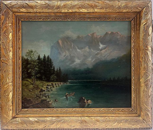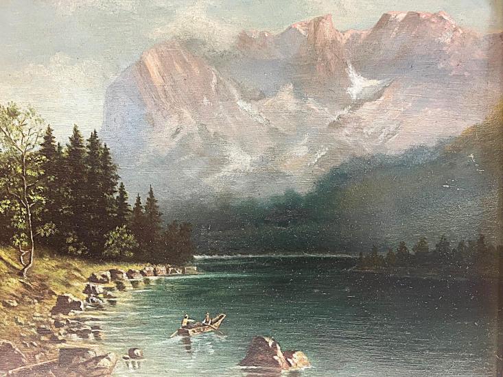 Dílo zachycující pohled do krajiny s výhledem na jezero a horu zahalenou částečně v mracích a mlžném oparu. Malba se vyznačuje pestrými barvami a detaily, jako například odrazy ve vodní hladině nebo světlo a stíny na listech stromů. Olej na překližce. Rozměry díla jsou 31 x 25 cm, rozměry se zdobeným rámem zlaté barvy jsou 43 x 37 cm. Na pravé straně v prostřední části je menší část barvy sedřená, na první pohled témeř neznatelně. Rám má tenké praskliny v povrchové vrstvě. Nesignováno.