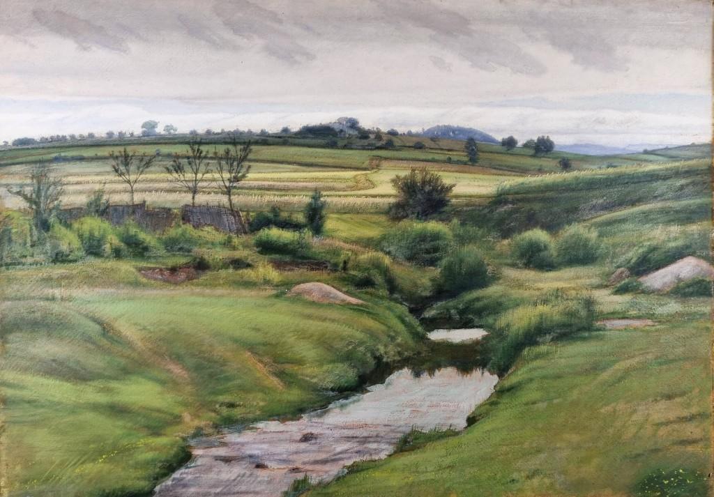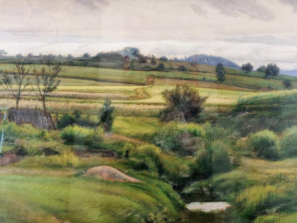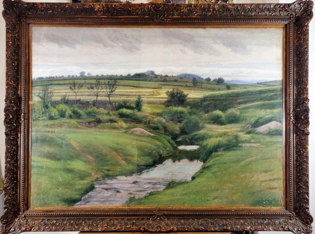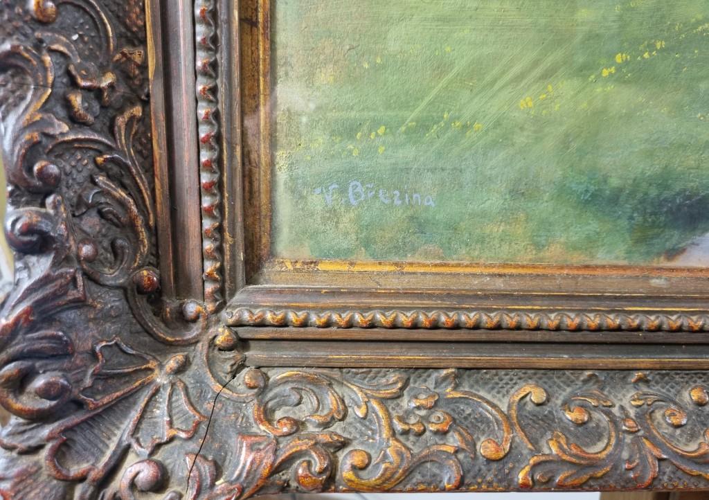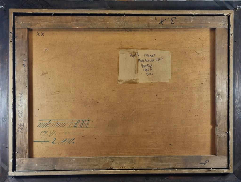 Olej na kartonu pod sklem, rozměry díla 100x71 cm, s rámem 113x85 cm. Signováno v levé dolním rohu "V. Březina".