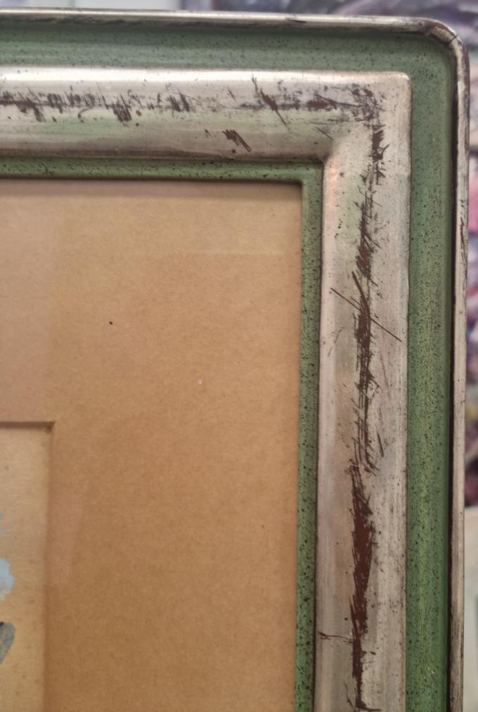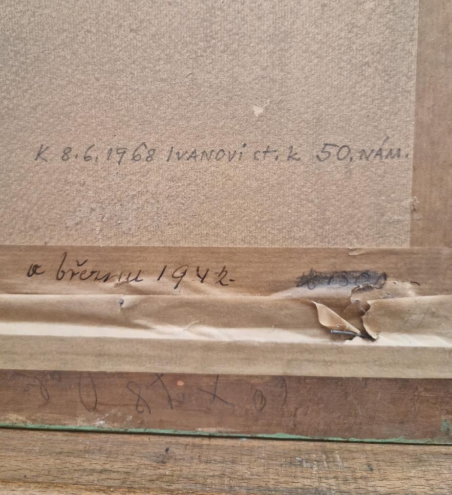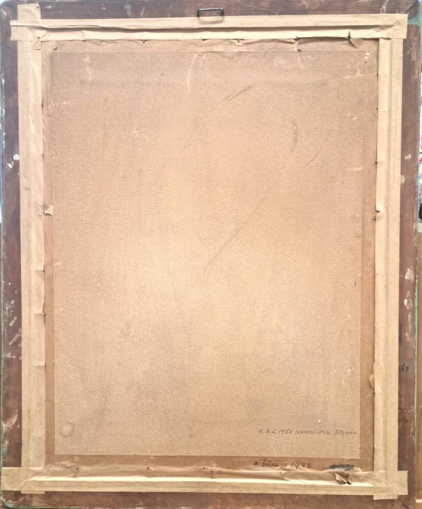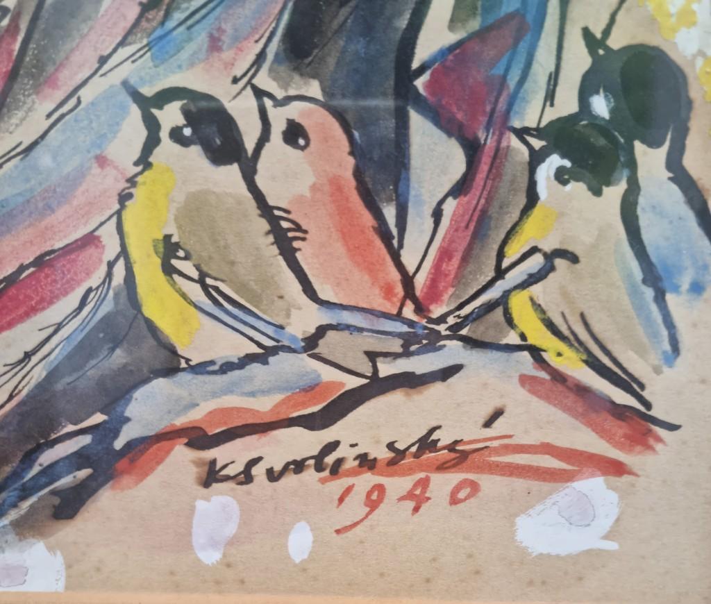 Dílo od českého umělce a grafika Karla Svolinského. V centru vidíme madonu, která drží květy a je obklopena florálním motivem a ptáčky. Ve svém díle Svolinský často tématizoval folklór a náměty s ním spojené, k folklóru odkazuje i barevnost tohoto díla. Vybarvené plochy jsou rámovány silnou černou linkou, příjemným momentem je i prosvítání původního povrchu. Obraz je rámovaný velmi originálním rámem s patinou. Kombinovaná technika na papíře pod sklem, rozměry s rámem 65 x 53 cm, bez rámu 41 x 29 cm.